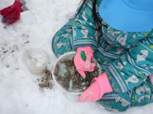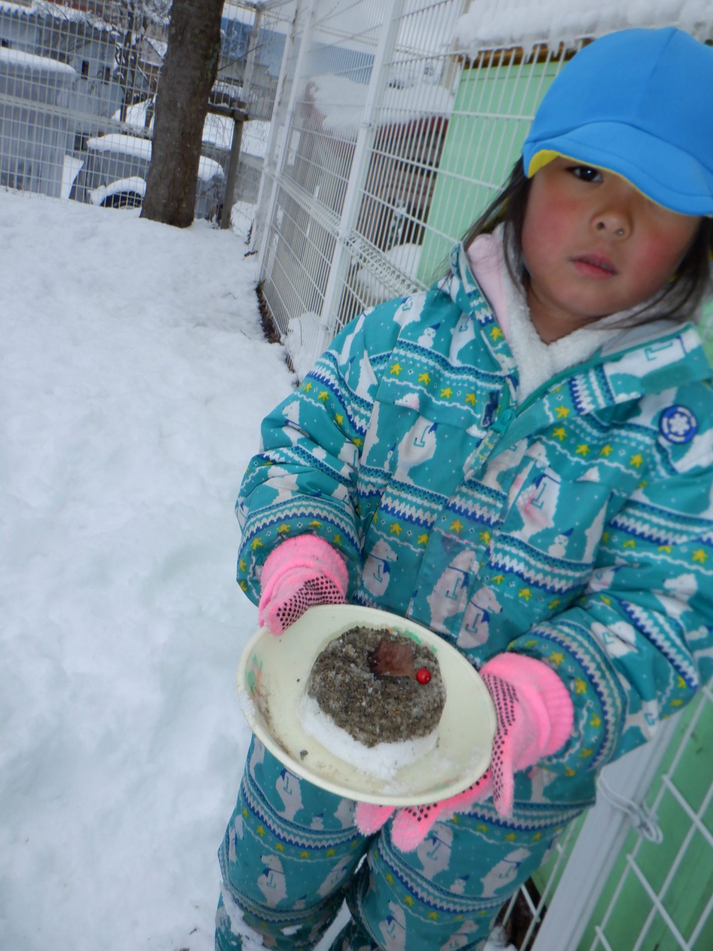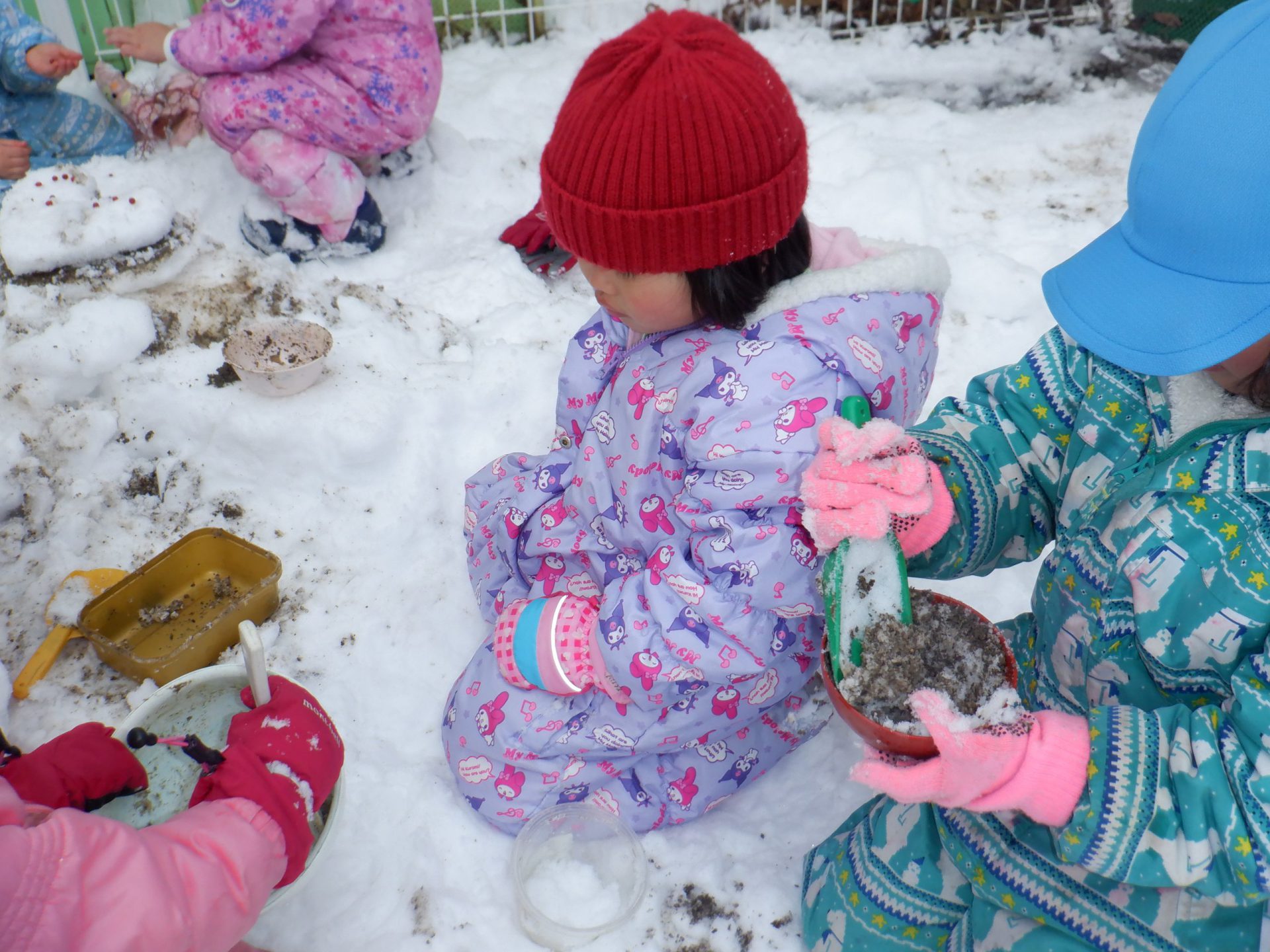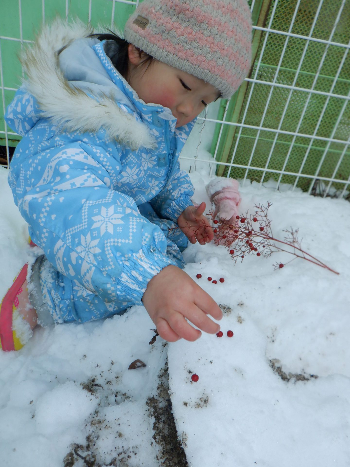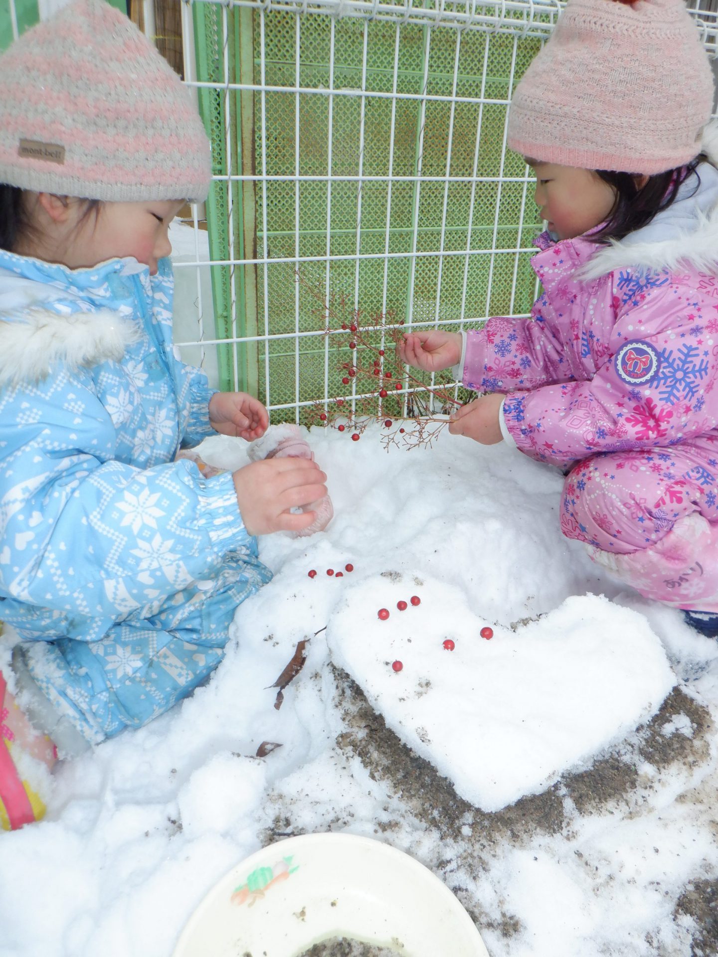 ほかの場所では、保育士に表面だけ固まった雪をハートの形に取ってもらうと「もういっこ、もういっこ。」と催促し、積み重ねて遊んでいました。その子どもたちもケーキ作りの仲間に入ってきました。南天の小さい粒は手が冷たくても手袋を外して飾ります。