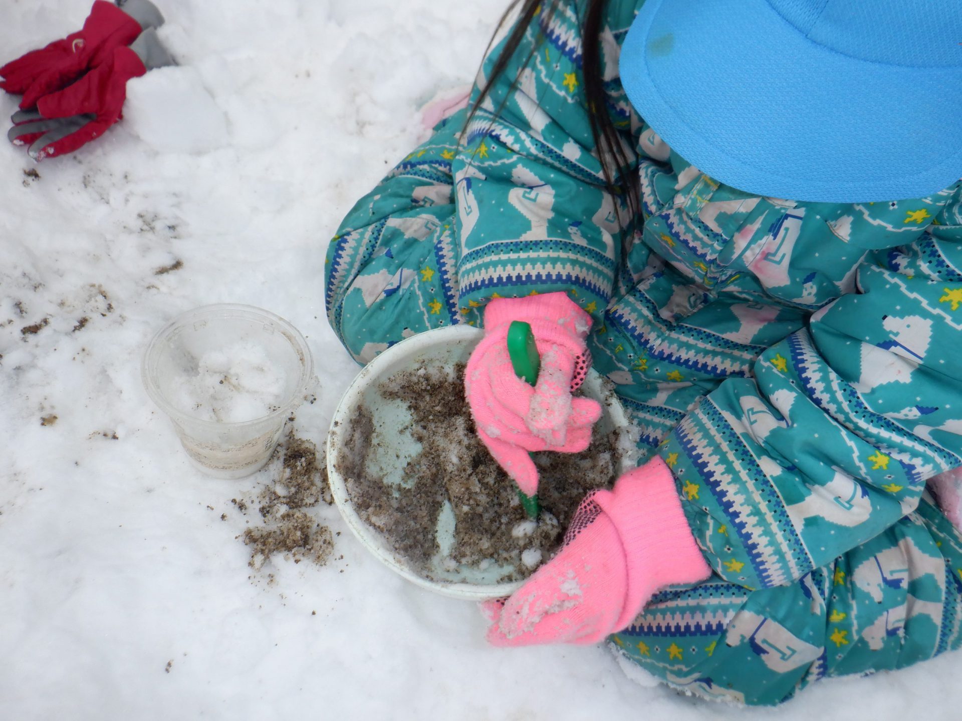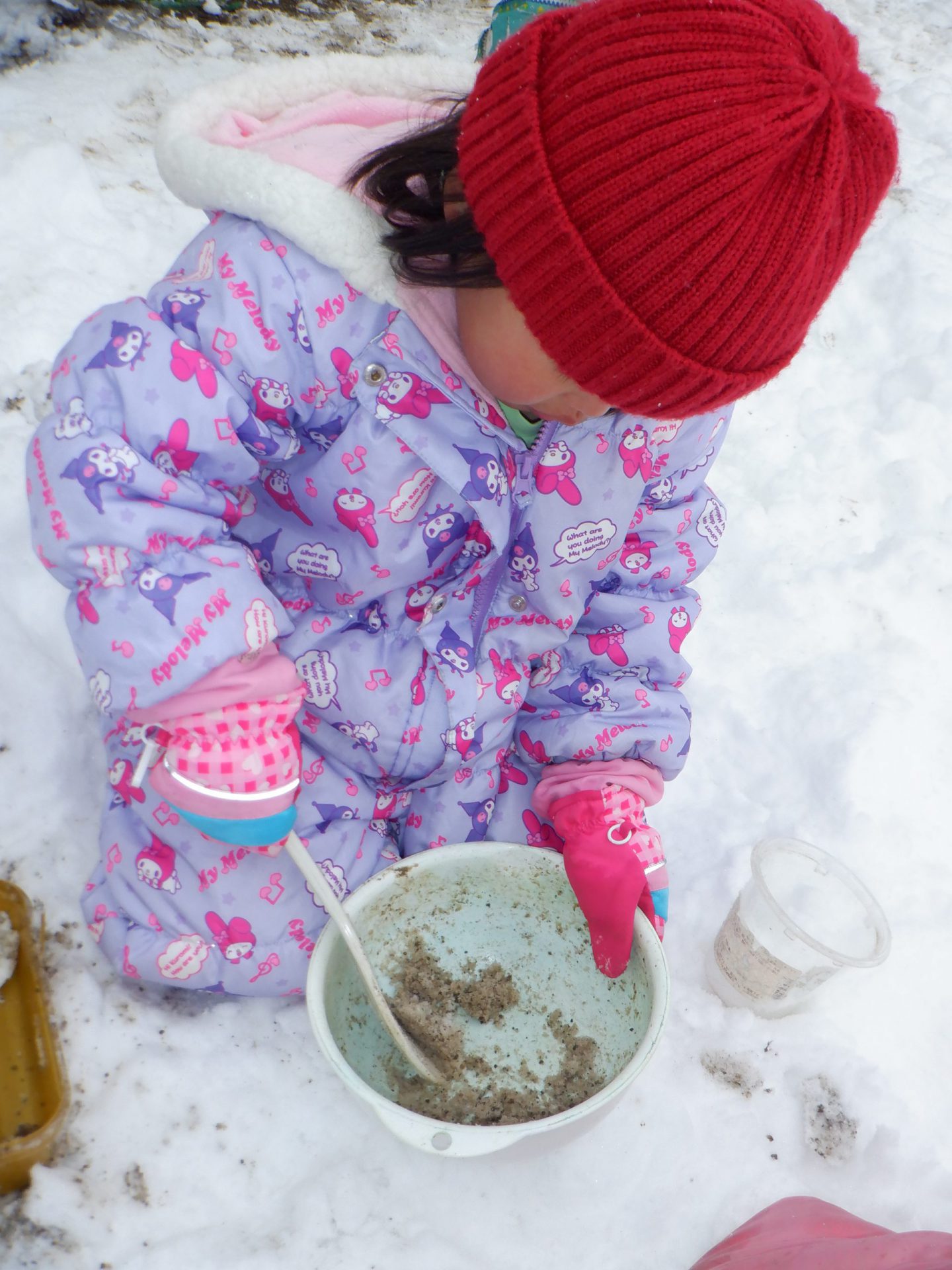 今日の園庭の雪は、砕いた堅い雪や堅い雪の下の雪の下の雪がサラサラしていて砂のように使うことができました。