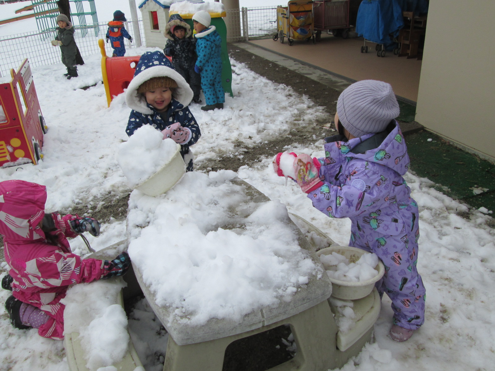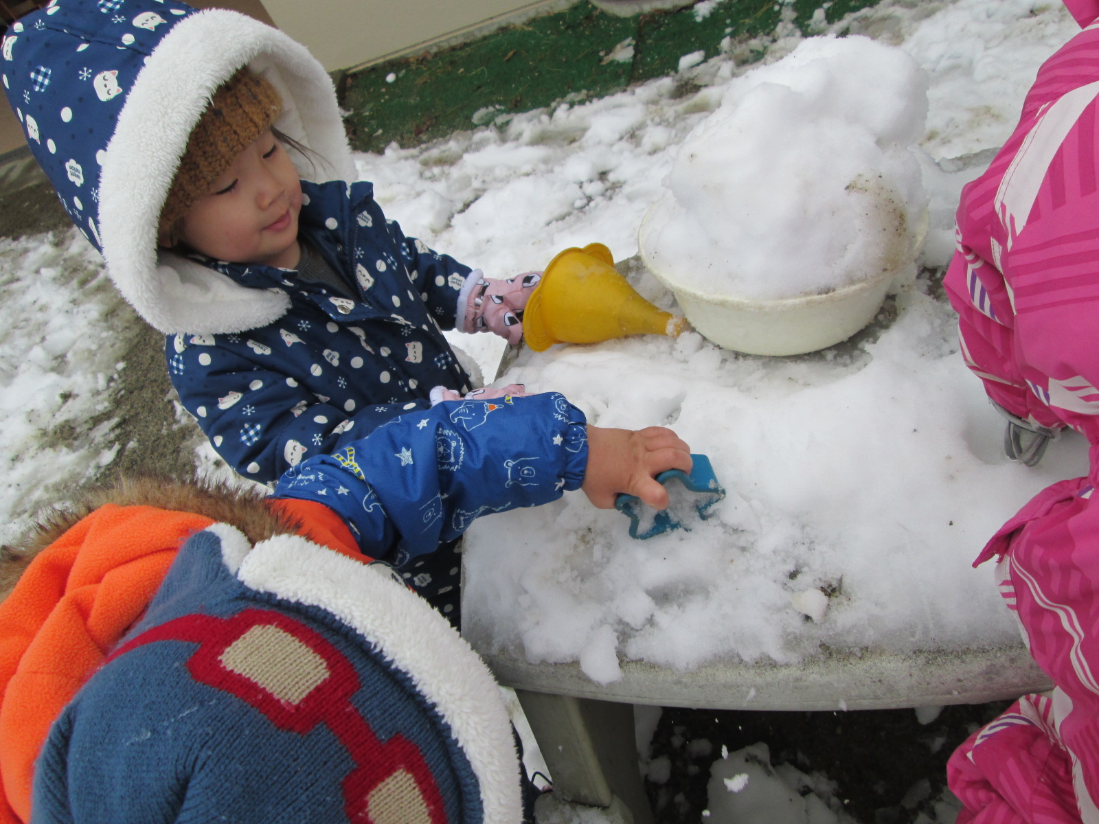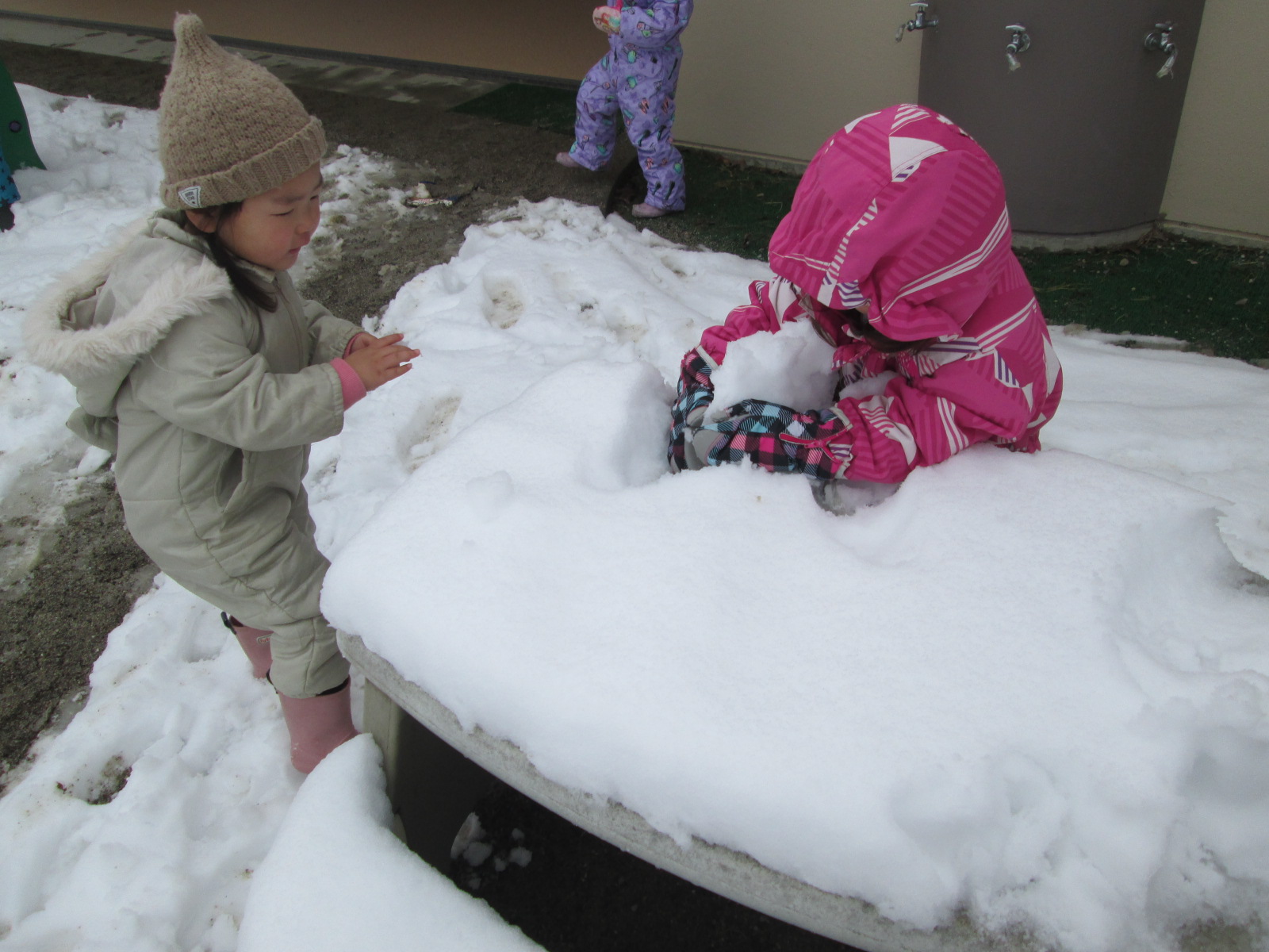 今回の雪は湿り気が多く簡単に固まりパン、ピザ、石鹸など見立てて遊んでいました。日頃のままごとや日々の生活の中から次々とイメージが広がり見立てて遊び 感性の豊かさに驚きました。ミニ雪だるまも自分でできたことで満足そうでした。