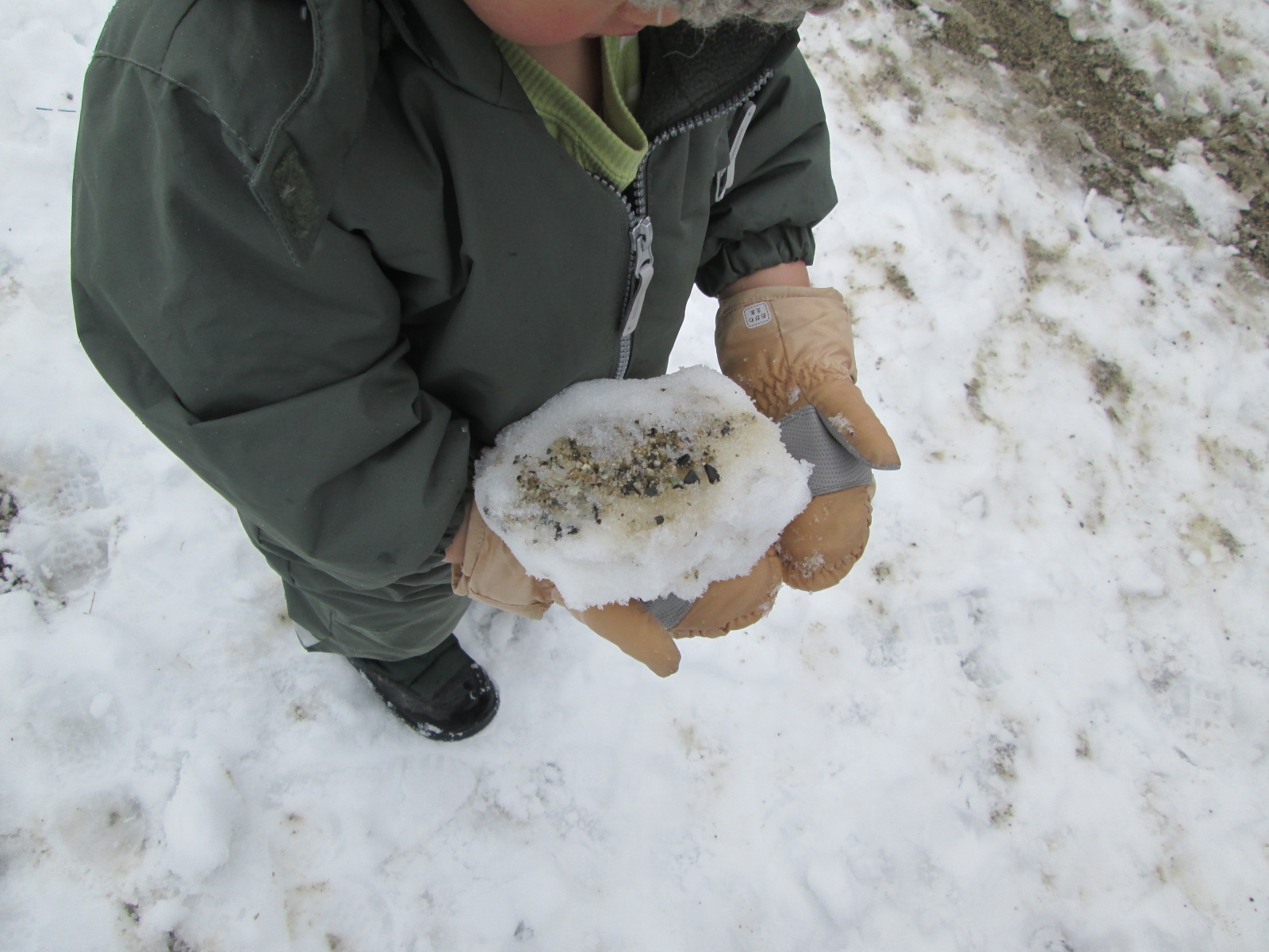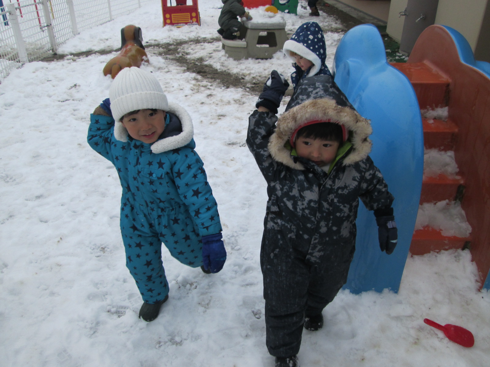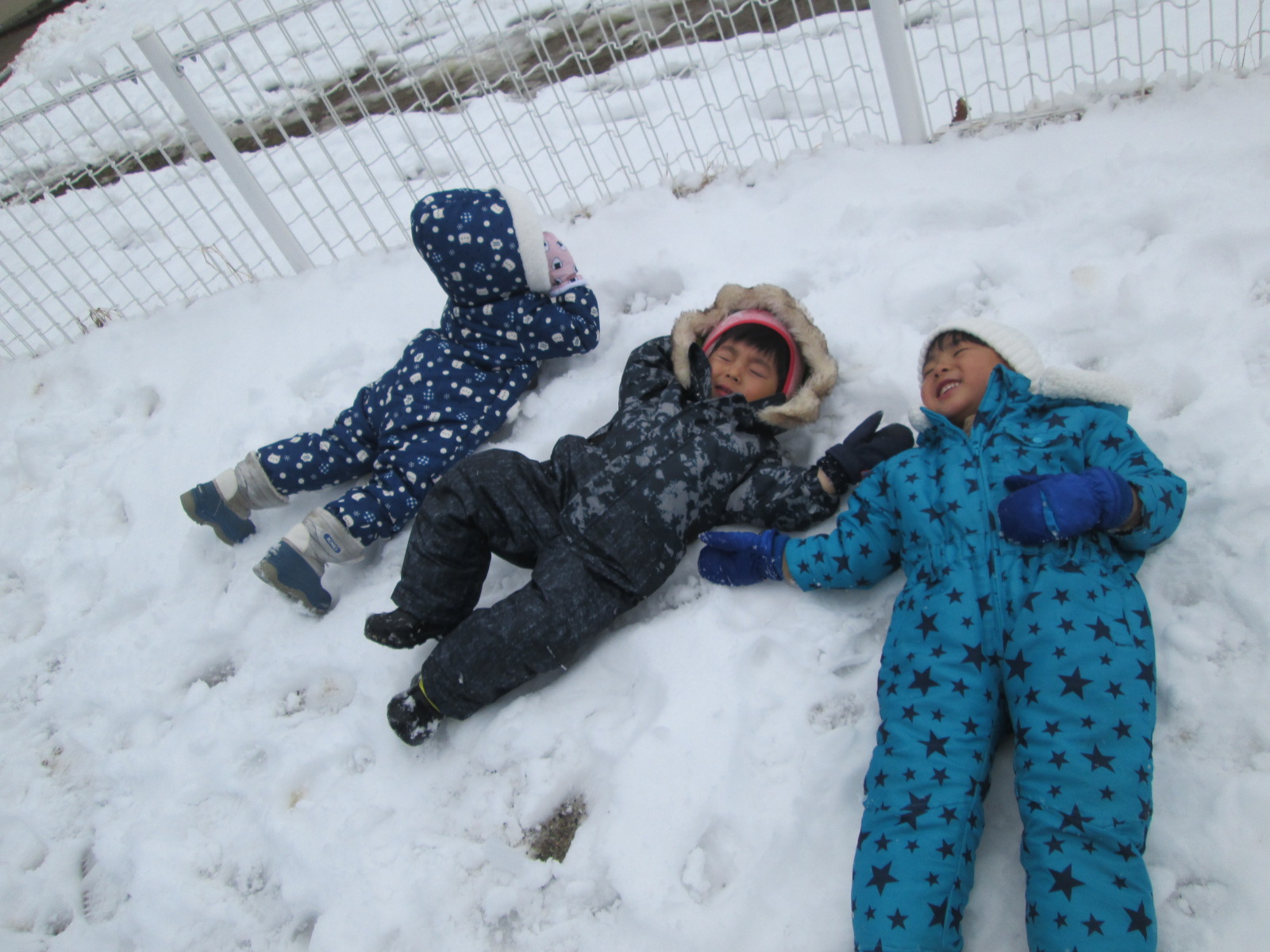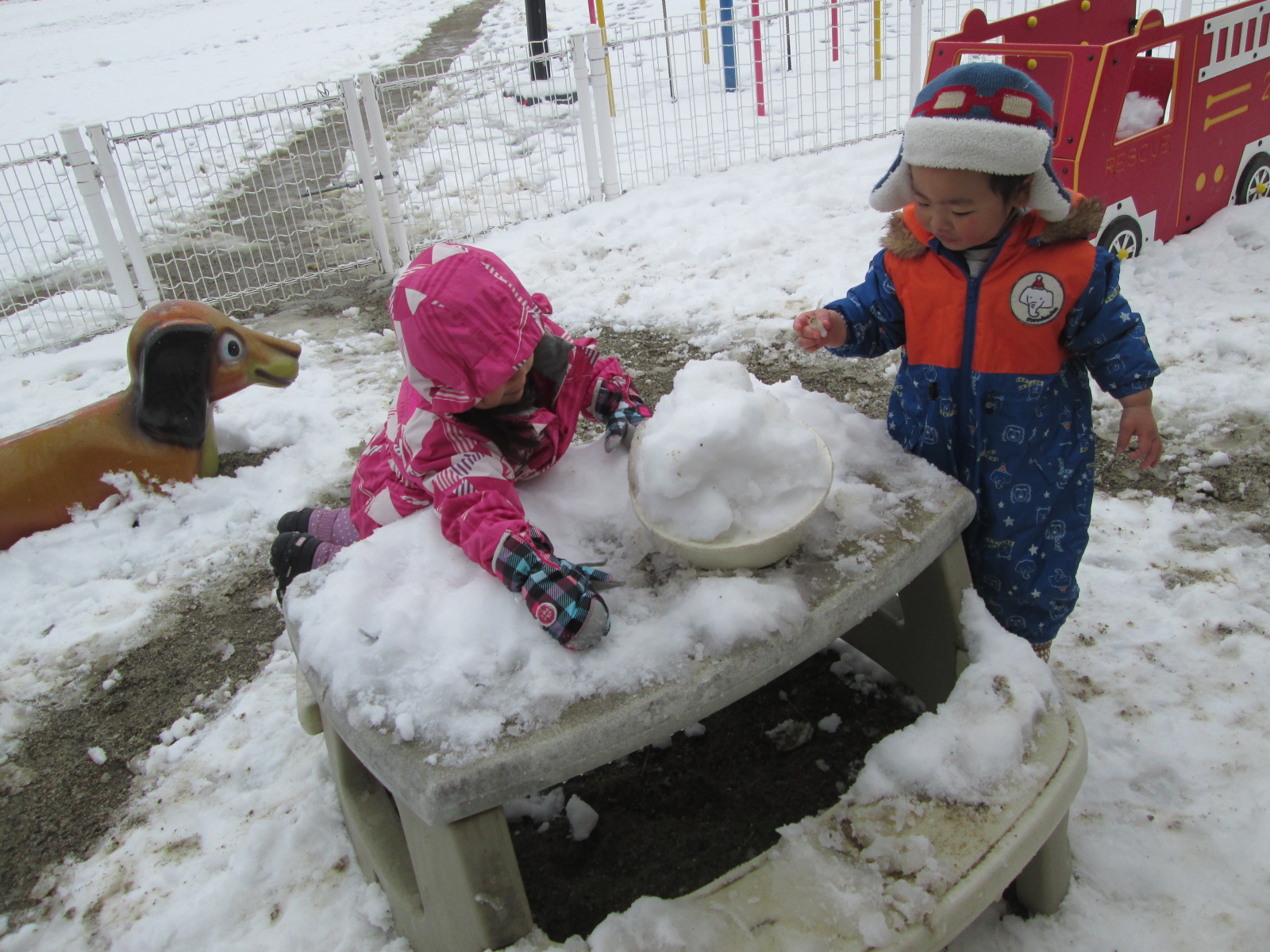 今回の雪は湿り気が多く簡単に固まりパン、ピザ、石鹸など見立てて遊んでいました。日頃のままごとや日々の生活の中から次々とイメージが広がり見立てて遊び 感性の豊かさに驚きました。ミニ雪だるまも自分でできたことで満足そうでした。
