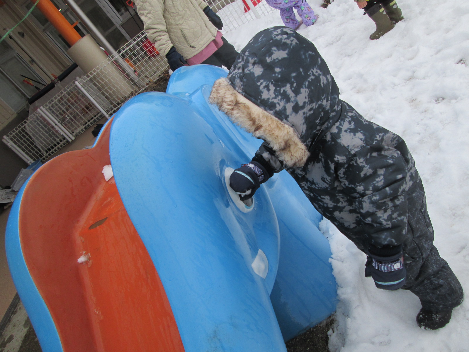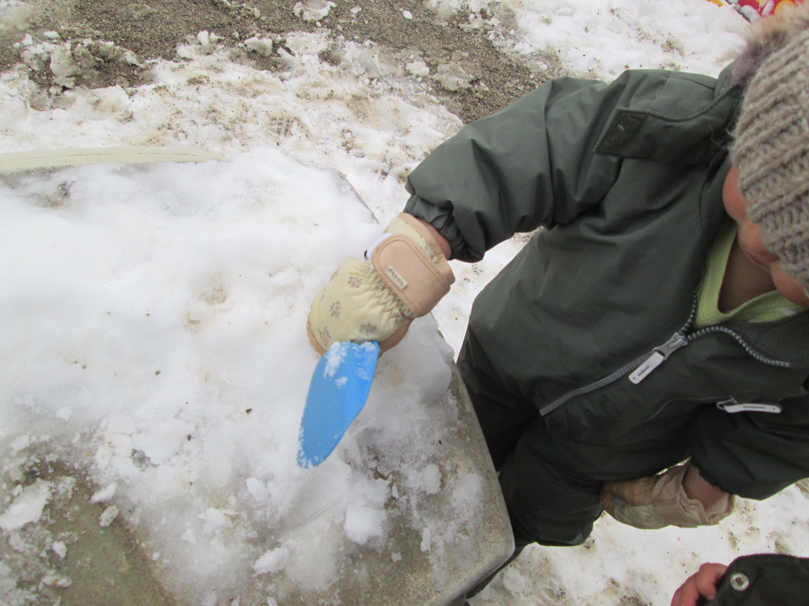 次の日 雪はだいぶ溶け水たまりができていました。シャベルですくって「魚釣り」と言っていました。そこに白い雪が入ると色が変わることを発見して雪の固まりを次々に入れ色が 白からじわじわ茶色になるのをずっと見ていました。目の前にある自然に興味を示す子どもたちでした。