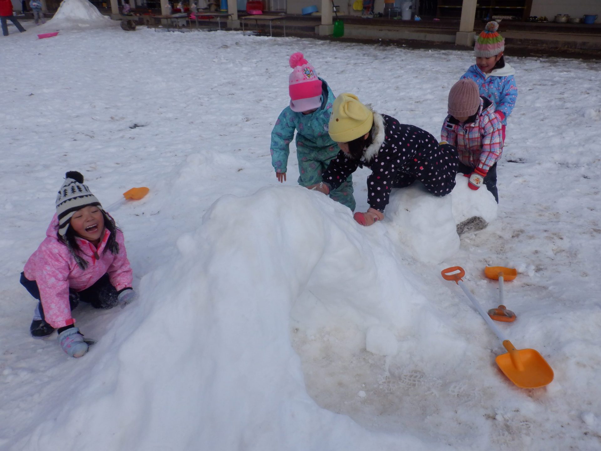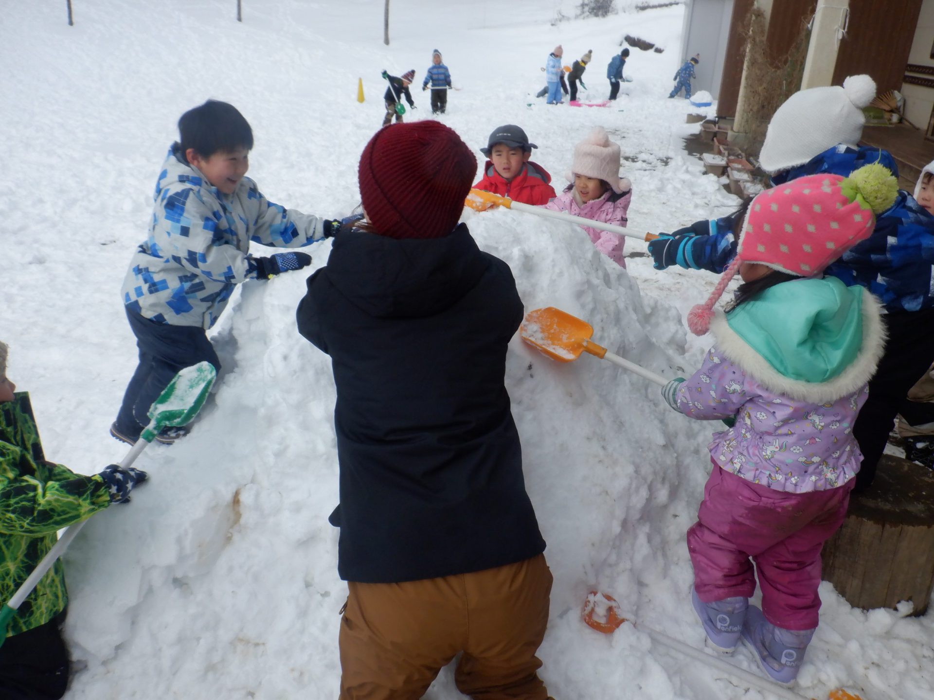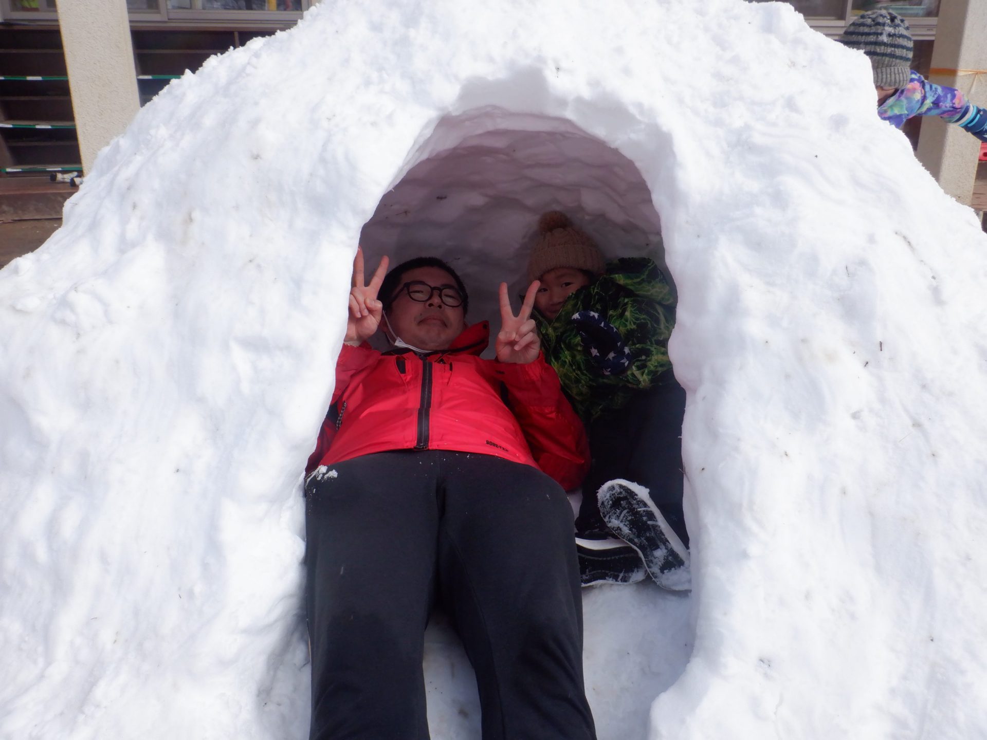 かまくら作りは、助け合いや協力の中で完成しました。完成した喜びもそうですが、何よりも作る途中での❝一体感❞を楽しんでいるようでした。