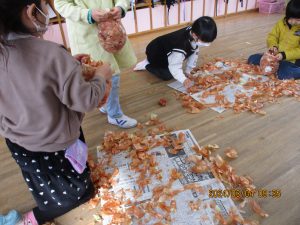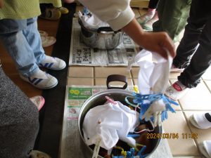 今まで集めておいた玉ねぎの皮を使って、染めものの『巾着袋』を作ってみよう。「いっぱい皮むいたね!」
