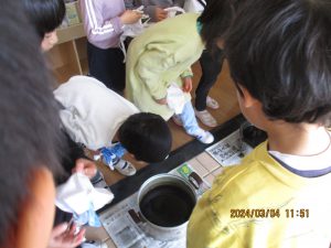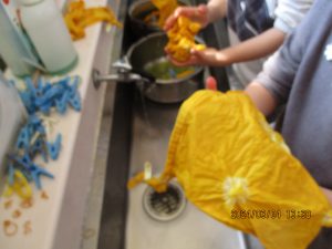 ミョウバンにつけて、さらに色が出てきました。「黄色になるんだね!」「せんたくばさみ取ったら色が違うよ」