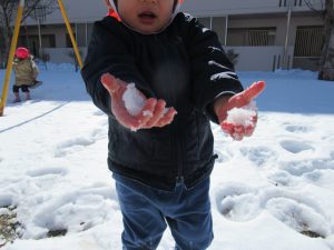 雪を手ですくって差し出すとそのまま素手で持ち、冷たい感触を体験。表面が硬くなった雪の上を歩くと、ザクザクと音がして初めての感覚。雪の層の中の粉雪を空中にまくと、キラキラとシャワーのように。水とは違った感触に目を細めてニコニコ。