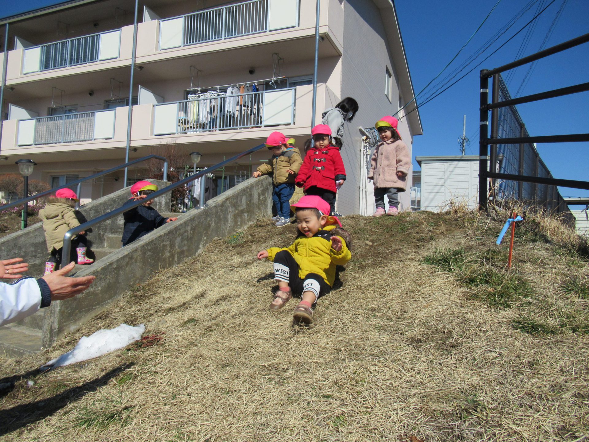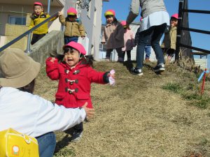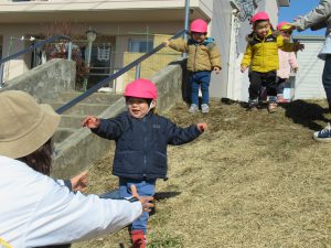 草の土手は今までにも散歩中に走り下り遊びをしている場所。冬は枯れ葉になっていますが手を広げて待っていてくれる先生の胸にGO!疾走感を味わいます。ソリのようには滑りませんがおしりで滑ろうとする子も。ズボンの土もなんのその。
