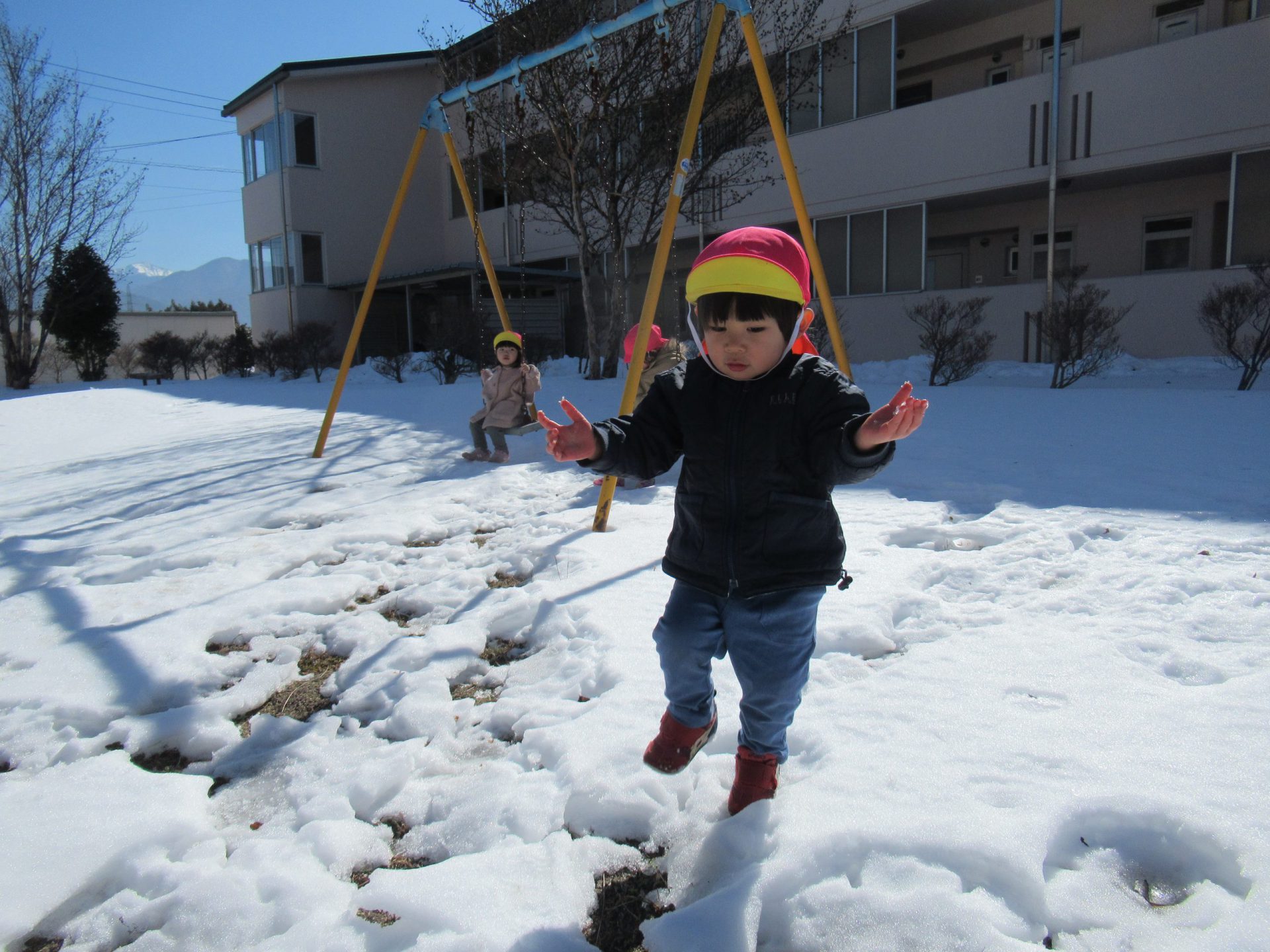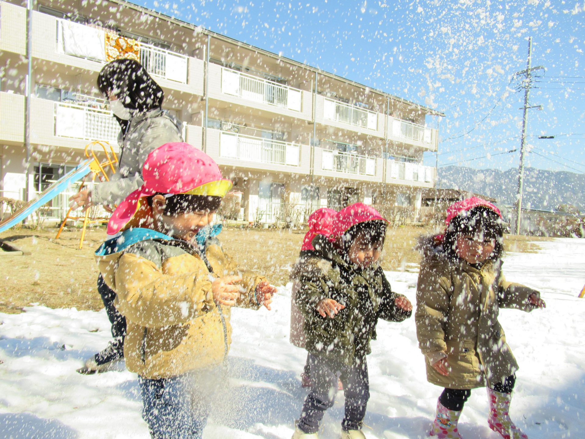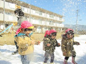 手で持つ・踏む・投げ上げるなど雪と触れ合って遊ぶことで、初めての感触や感覚を楽しめたと思います。土手滑りは最初の頃より走り方がじょうずになり抱きかかえる側にも子ども達が小さなスリルを楽しんでいるのが伝わってきます。