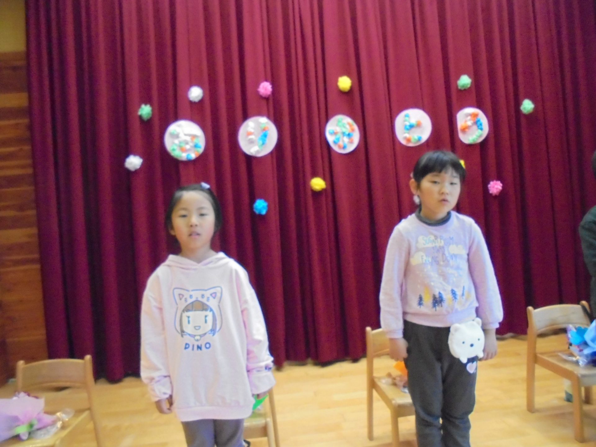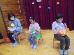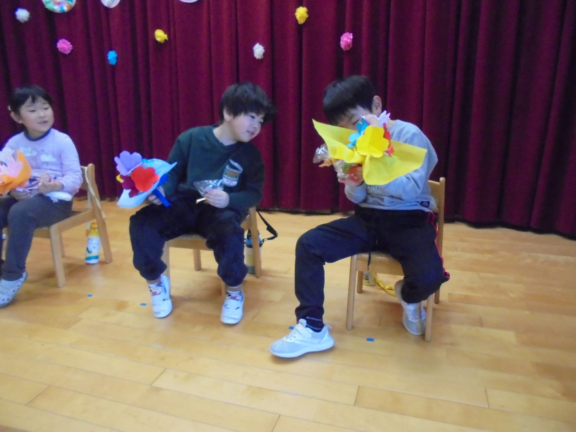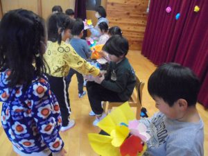 「小学校に行っても元気でね!」とぱんだ組から歌と花束、キーホルダーのプレゼントを贈りました。