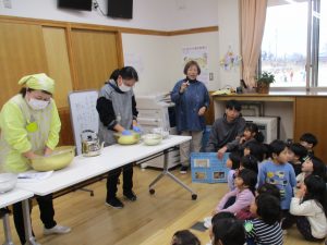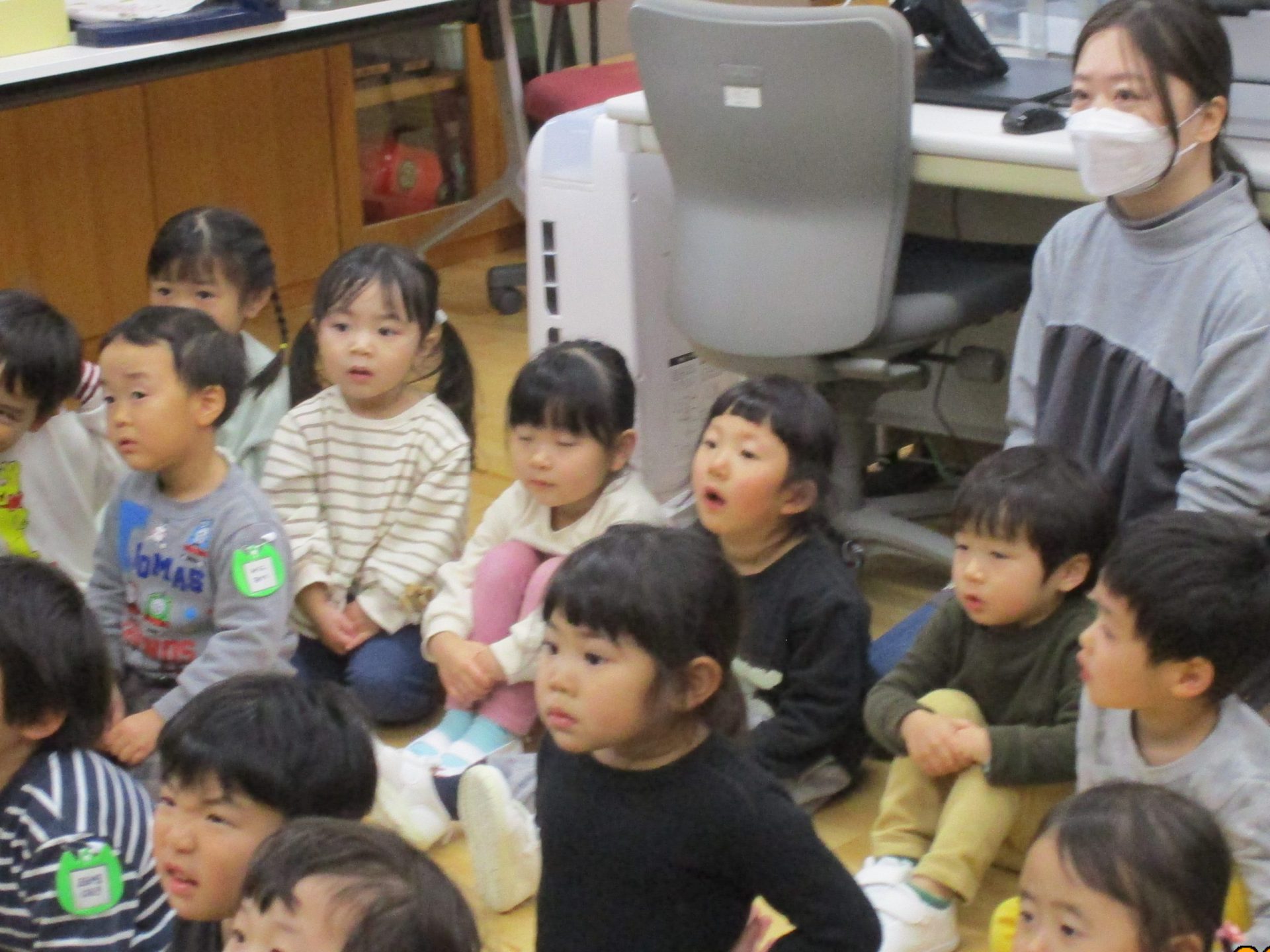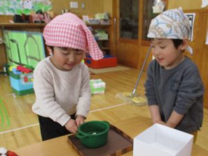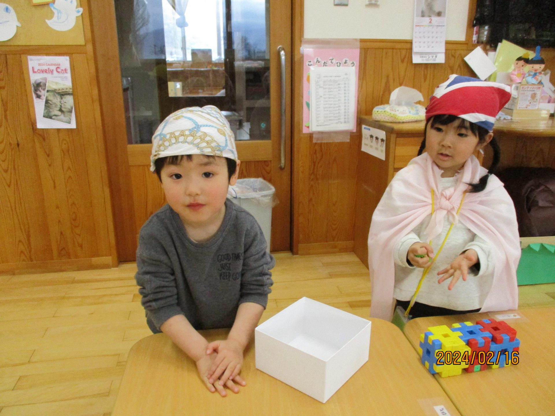 ものづくりの日も豆まきの日も由来の話は少し難しくても、準備をする保育士の姿をじーっと見ていた子ども達。