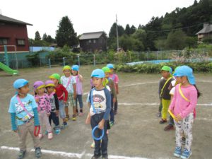 今日みんなでやりたい競技、その為に必要な物品、ルール等の進め方等、子どもたちからの発信や「○○やりたい!!」の気持ちから運動会ごっこを進めました。自分たちがやりたいと思った競技ができることへの喜びを感じたり、ルールや約束を年上の子が年下の子に教えてあげたりすることで、子どもたち1人ひとりが主役となり活動を楽しむ姿が見られました。