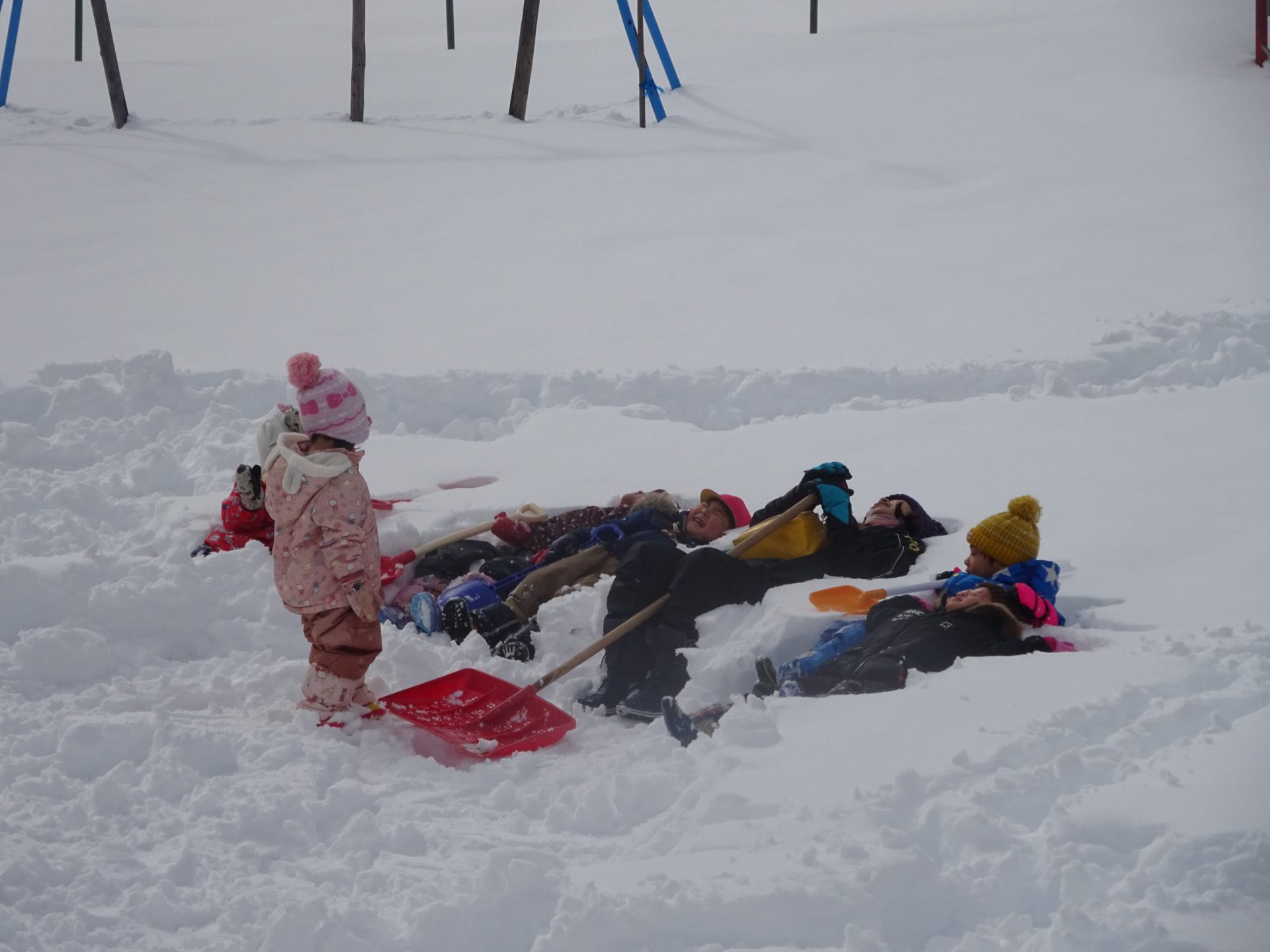 かまくら作りで汗をかいた後、みんなで雪の上に寝転がり「気持ちいいね」などと話す姿がありました。