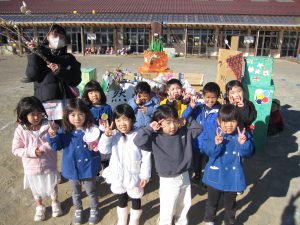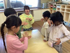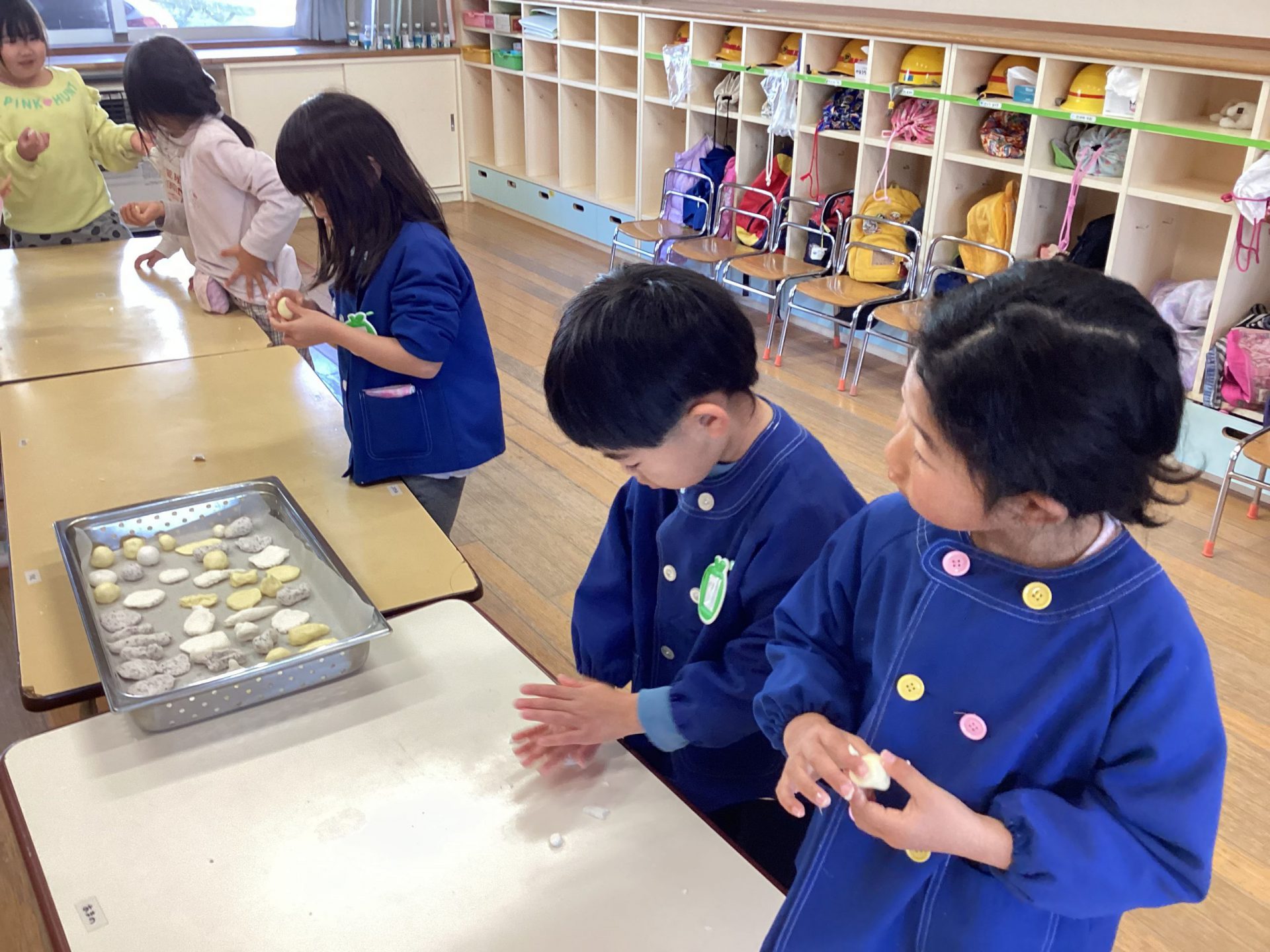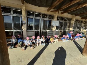 みんなで「健康にすごせますように」とお祈りして燃えるのを見守りました。お昼の時間には、給食の先生が作ってくれたまゆ玉を食べ、「おいしい!」と大喜びの子ども達でした!