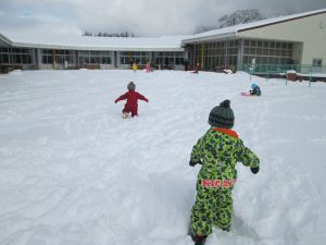 待ちに待った雪が降り、会染保育園の園庭にもたくさんの雪が積もりました。