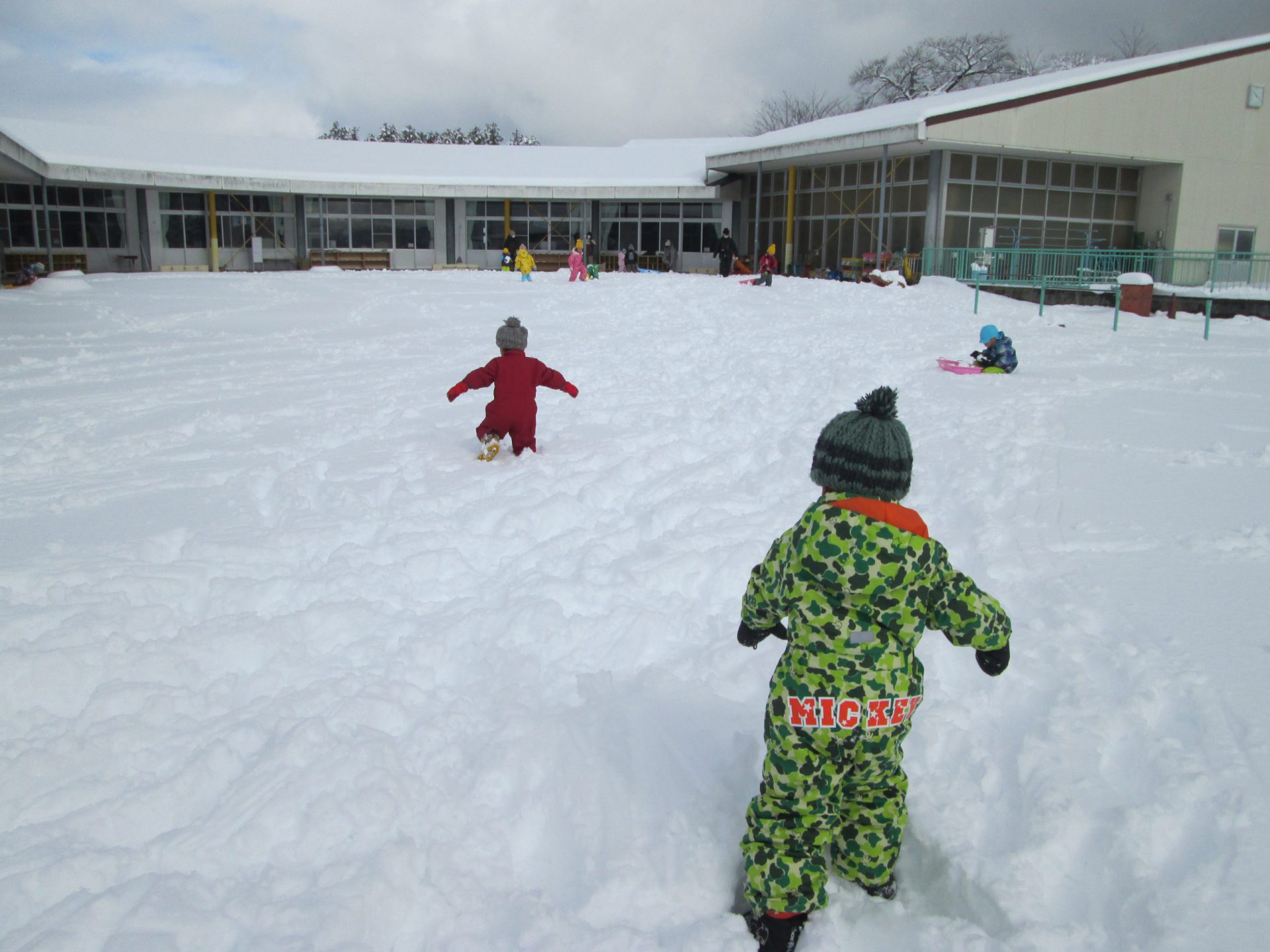 ひざの辺りまで雪に埋もれながらも追いかけっこを楽しむ子どもたちです!