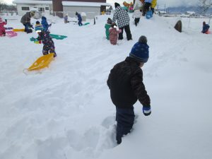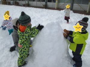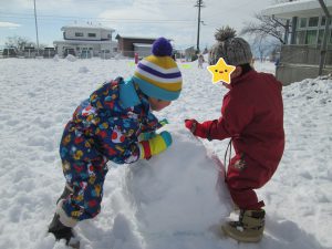 ・雪遊びを通して異年齢での関わりを楽しむことができました。一緒に一つの物を作ったり、小さい子のそりを押してあげたり。お友だちを思いやる気持ちが育つといいね。