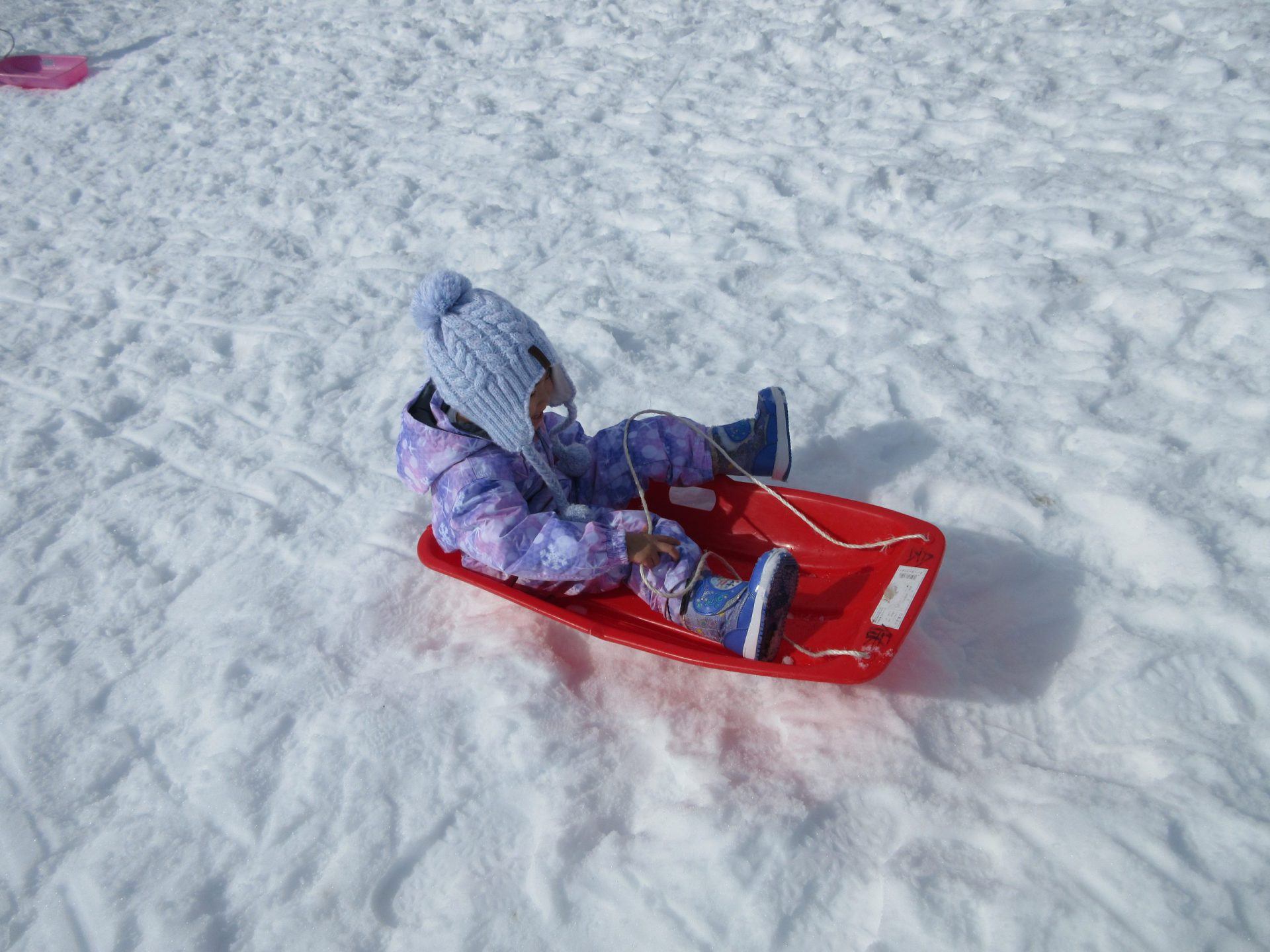 ・雪の冷たさに触れてびっくりしている子どもたち。そり遊びなど繰り返し遊ぶ楽しさを味わいました。