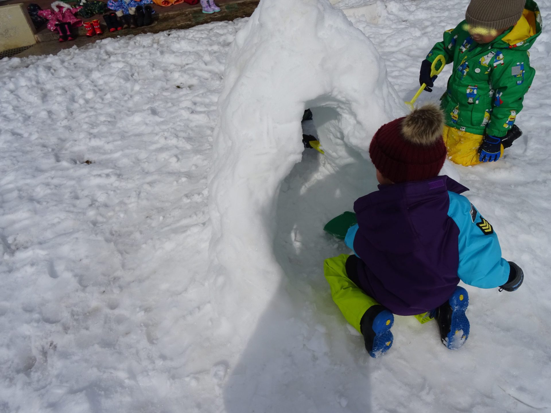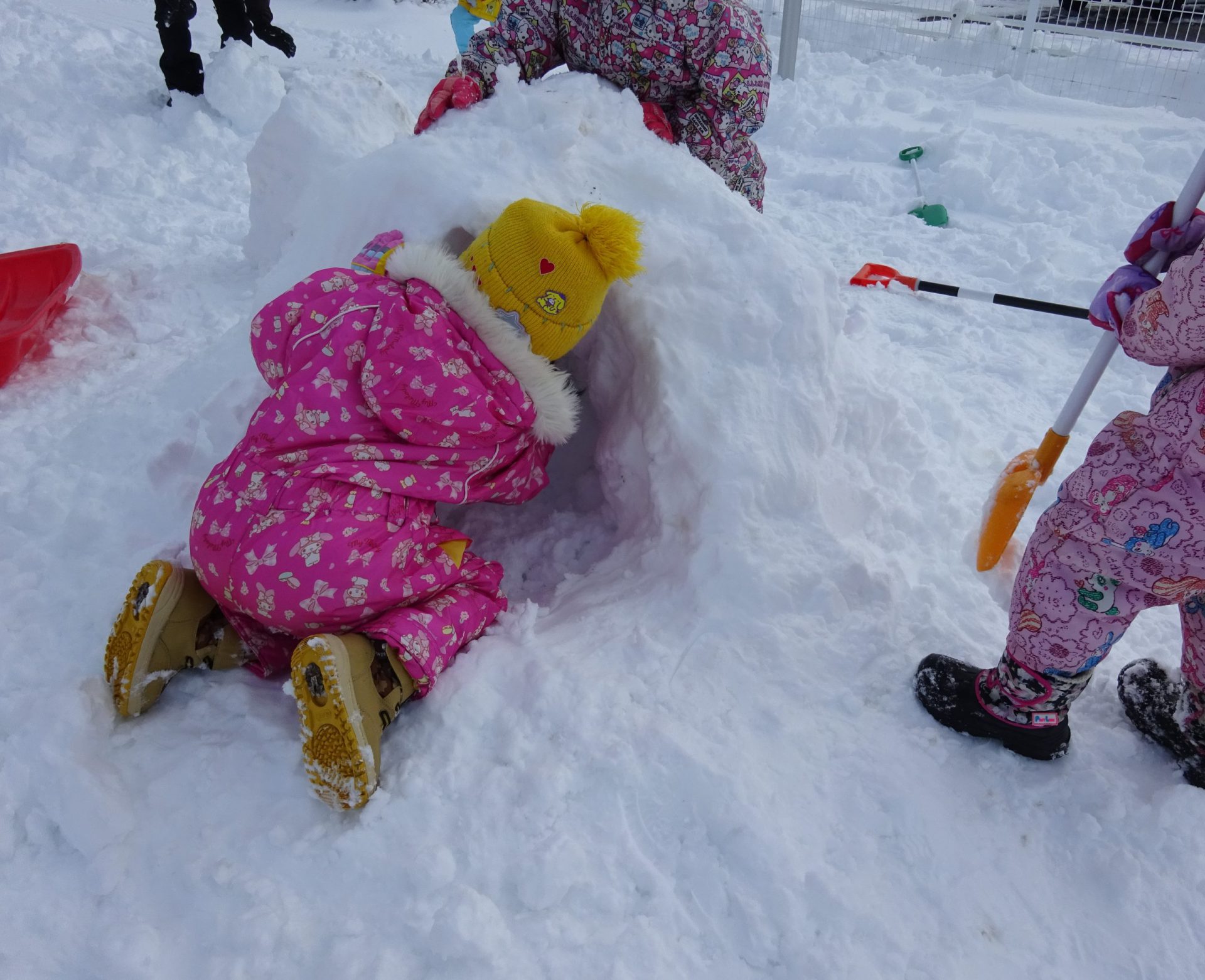 こっちではお友だちが集まってかまくら作り。