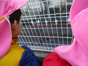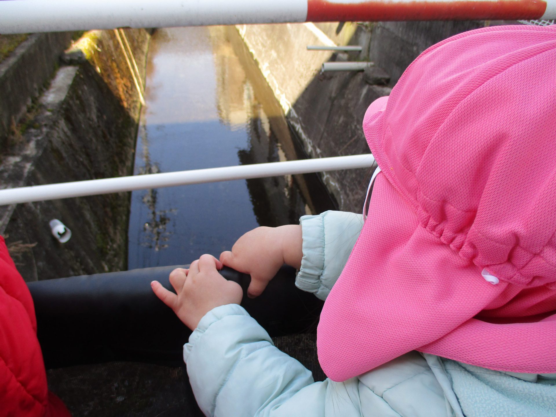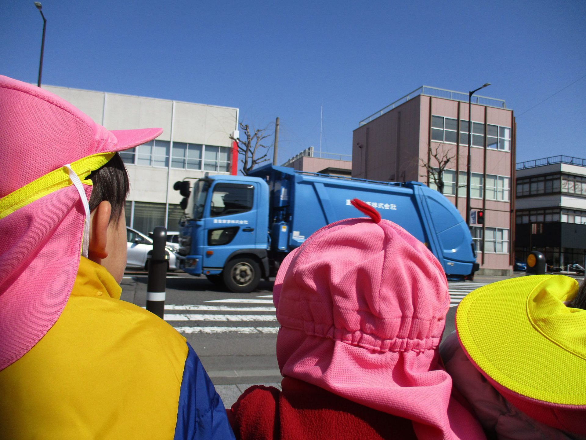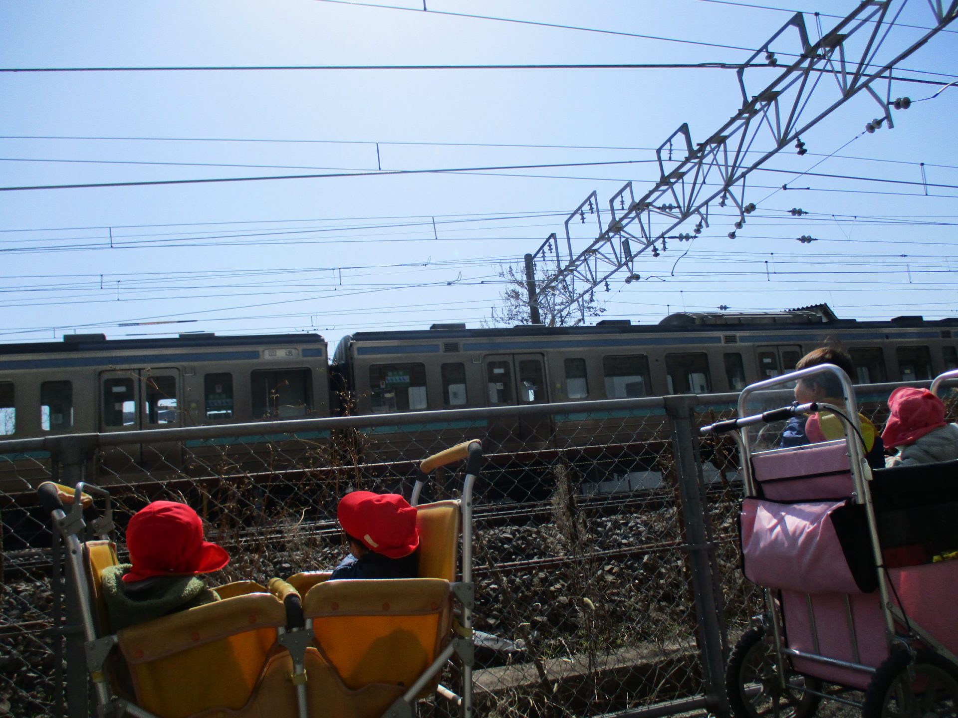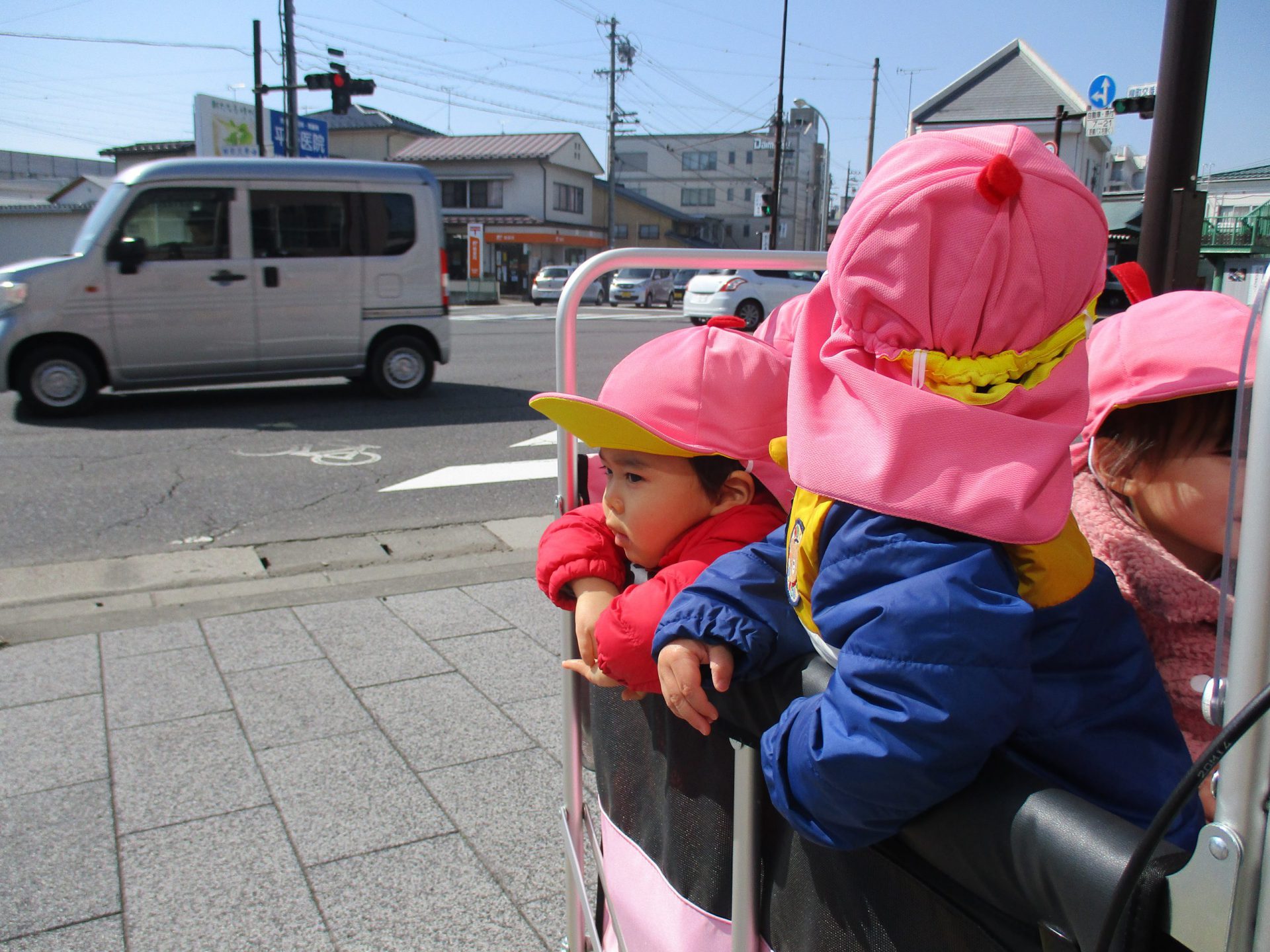 入園して半年余り、初めて散歩に行ったのは10月でした。車好きな子が多く、表情から散歩を喜んでいることが伝わってきましたが、初めての経験ということもあり、環境に圧倒されている様子もありました。そこから、5か月。今では圧倒される様子もなく、一語文や二語文、声で感情を知らせてくれるようになったことで、より子どもたちが楽しんでいることがわかるようになりました。柳町保育園、特に0,1歳児の保育室からは新幹線が走っている様子が見え、園周辺の道路は交通量が多いため車が身近な存在です。未満児でも行ける距離の散歩コースに電車や車が見られる場所があり、大好きな乗り物を子どもたちに見せてあげたいという思いで散歩に出かけています。これからも自園の良さを活かし、子どもたちが発見したことやうれしいきもちに共感していきたいと思います。
