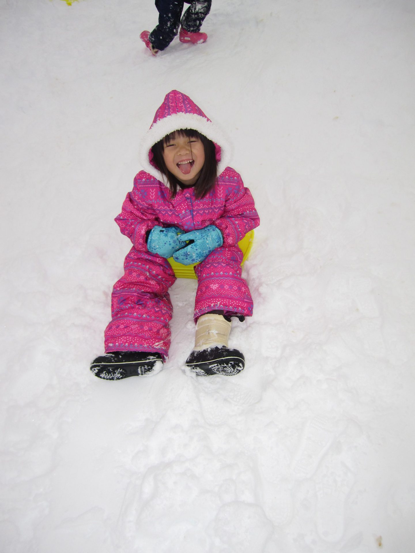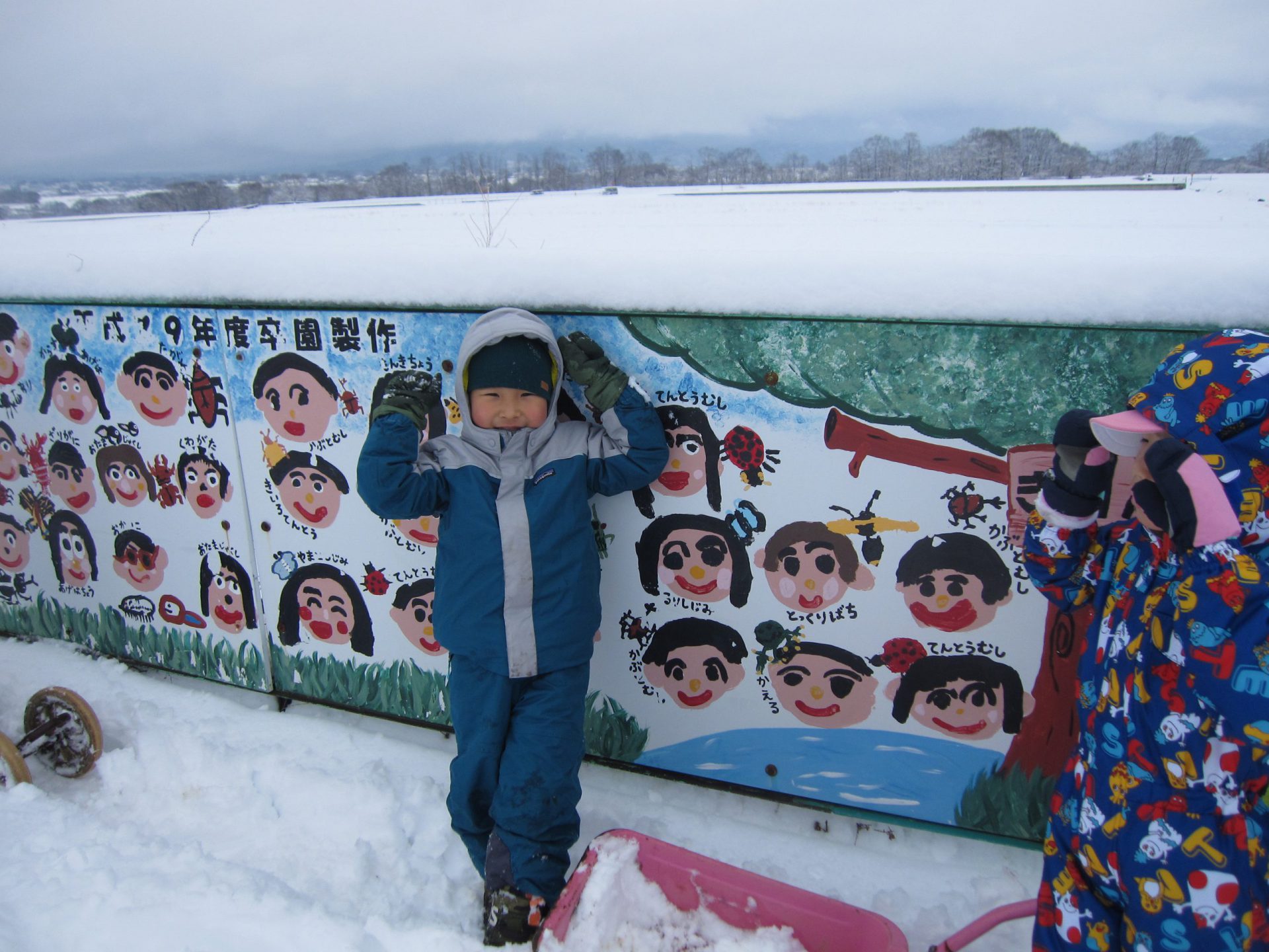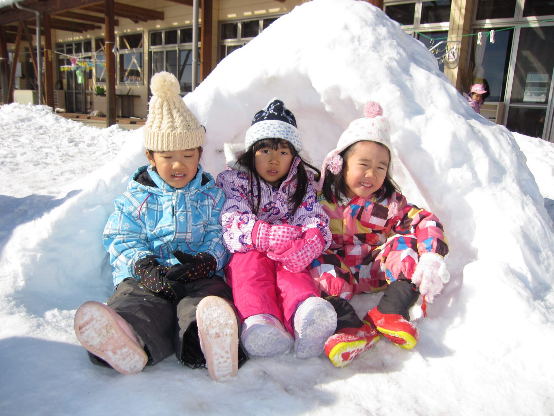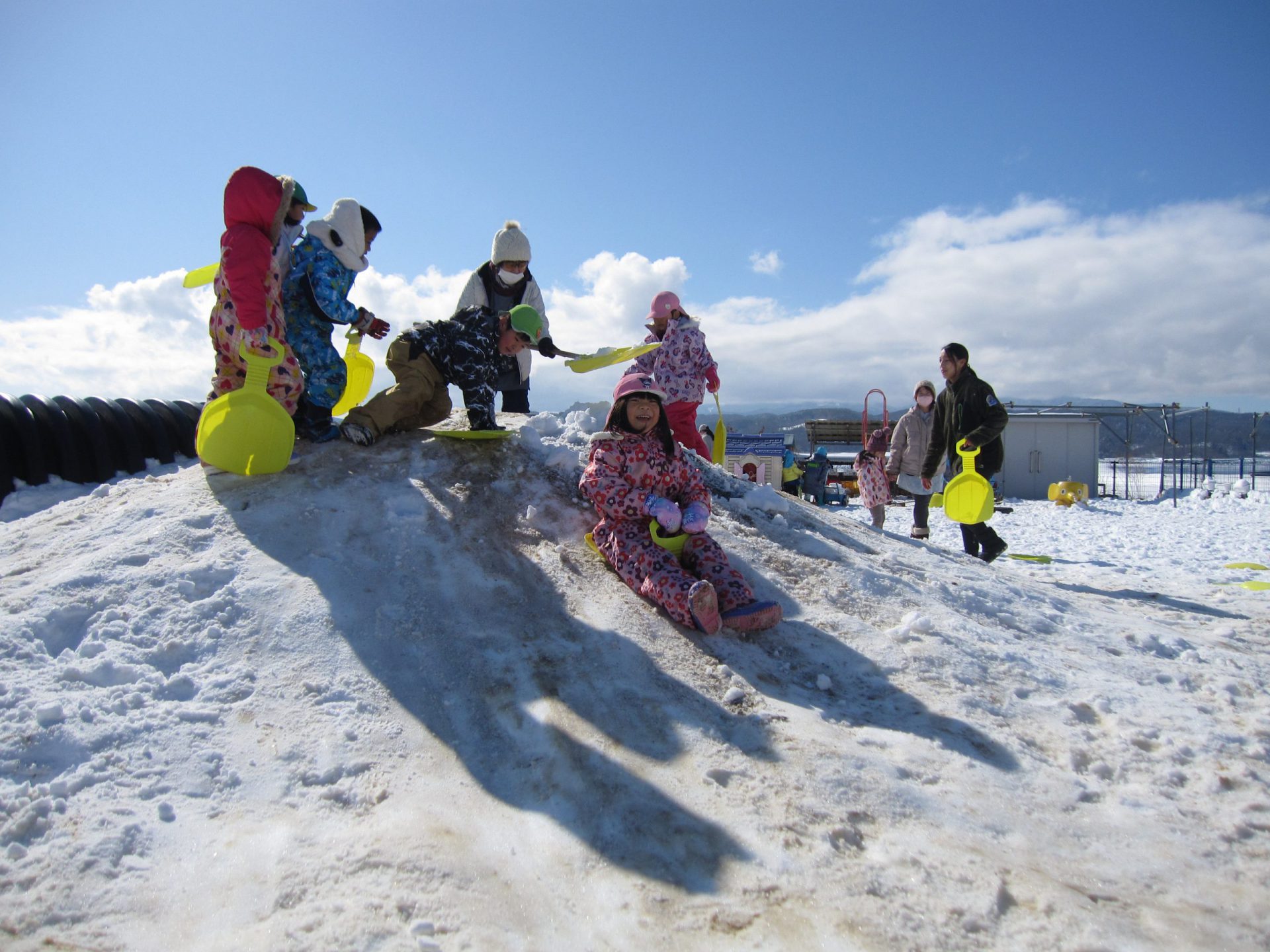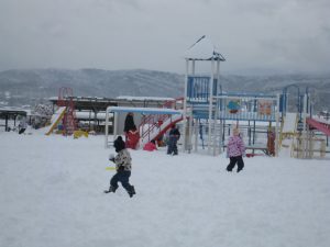 庭の築山にも雪が積もり、そりすべりを楽しむ子ども達!