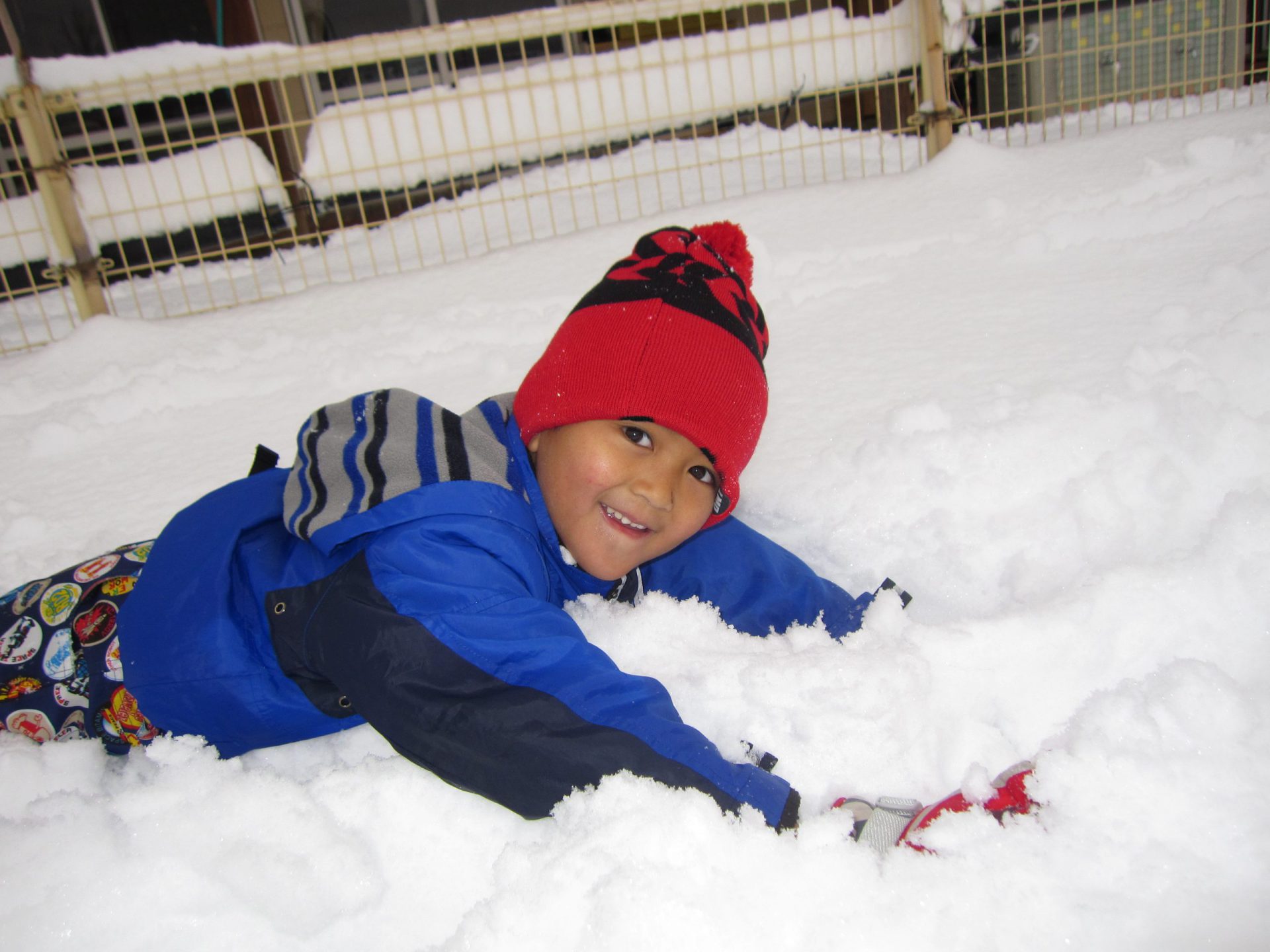 想像以上の大雪に大興奮の子ども達。早速スキーウェアに着替えて雪遊びです!!