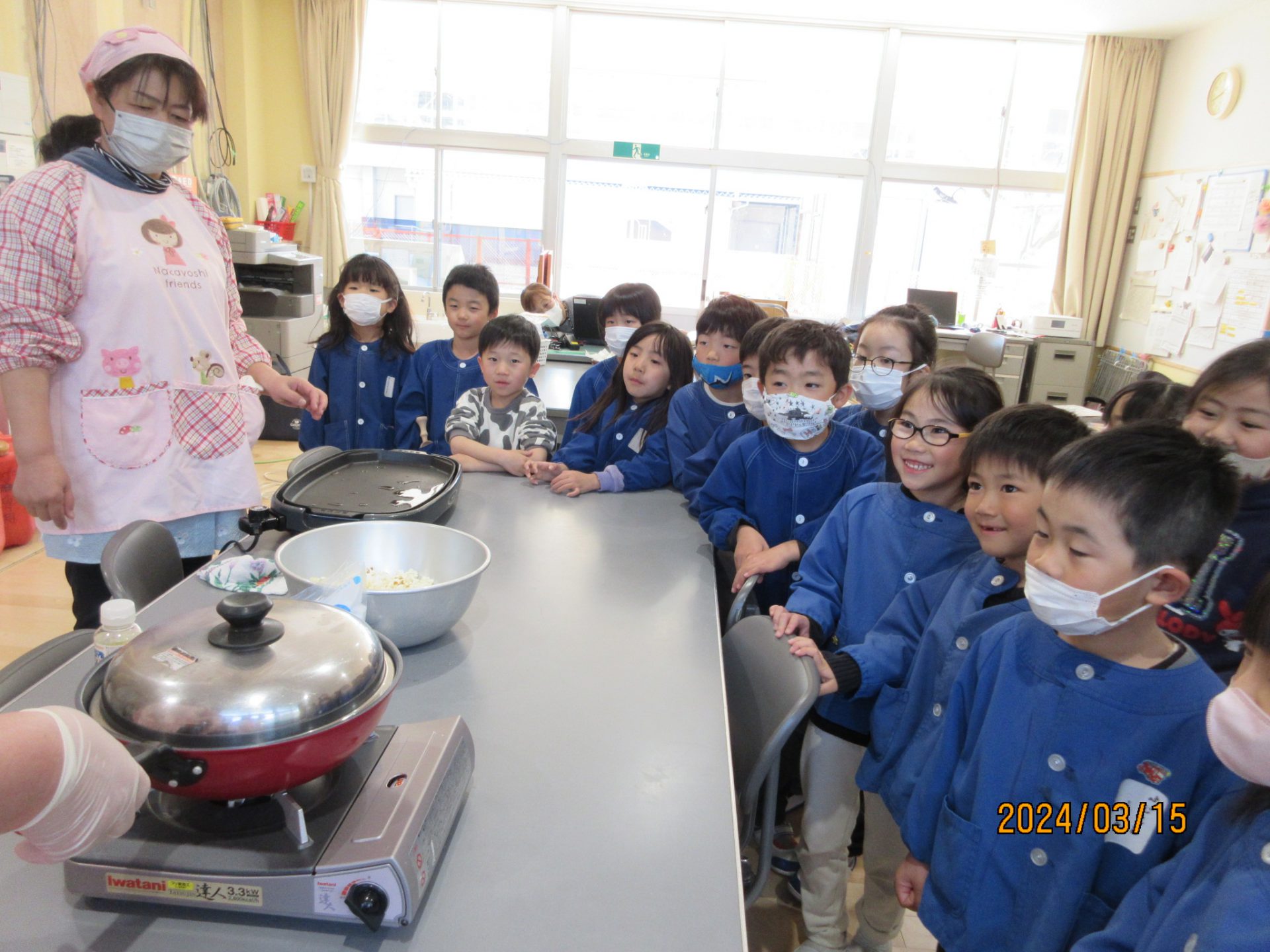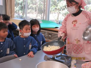 年長さんがポップコーンができるところを楽しみに見ています。種をフライパンに入れて火にかけるとポンポンとはじけてポップコーンの匂いがしてきます。