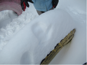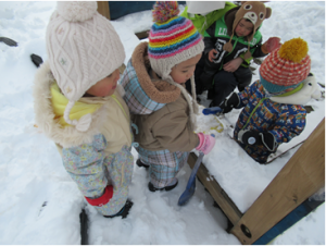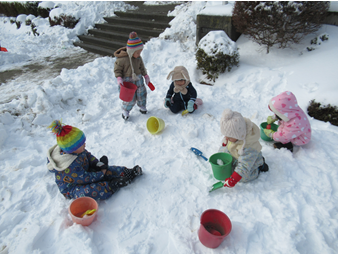 雪の感触を確かめたり、雪をお皿にのせたりバケツにつめたりして楽しむ。