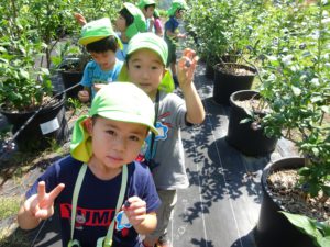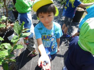どんなブルーベリーがおいしいのかお話していただき、大きくて色が黒っぽいブルーベリーを選んで木からもぎ取って食べていました。数をかぞえながら食べる子もいました。多い子は100個近く食べ、大満足の様子でした。