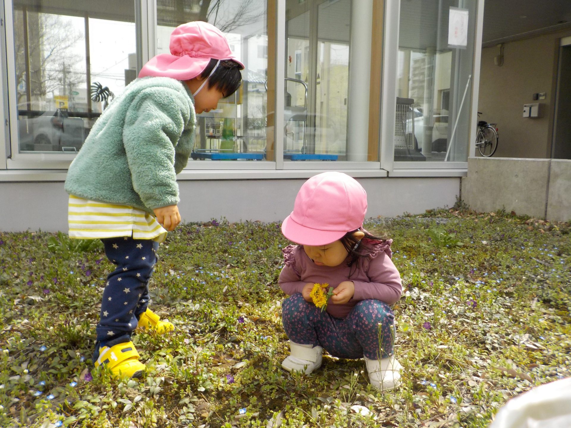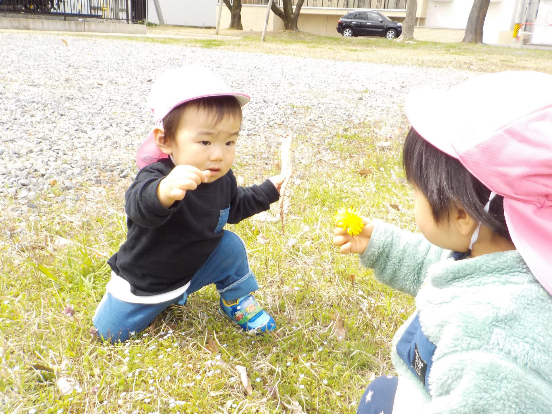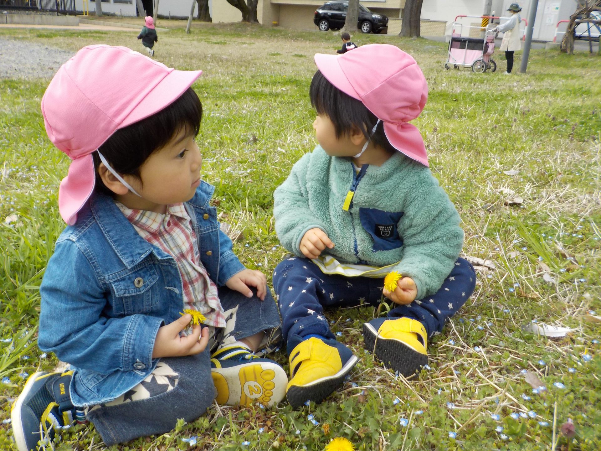 ん?タンポポを探していた二人が、何か見つけたみたいです。何かな?