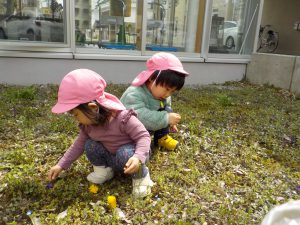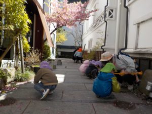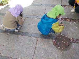 「きれいー!」「はなびら落ちてる」きれいな花びらを、みんなで拾います。