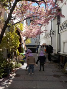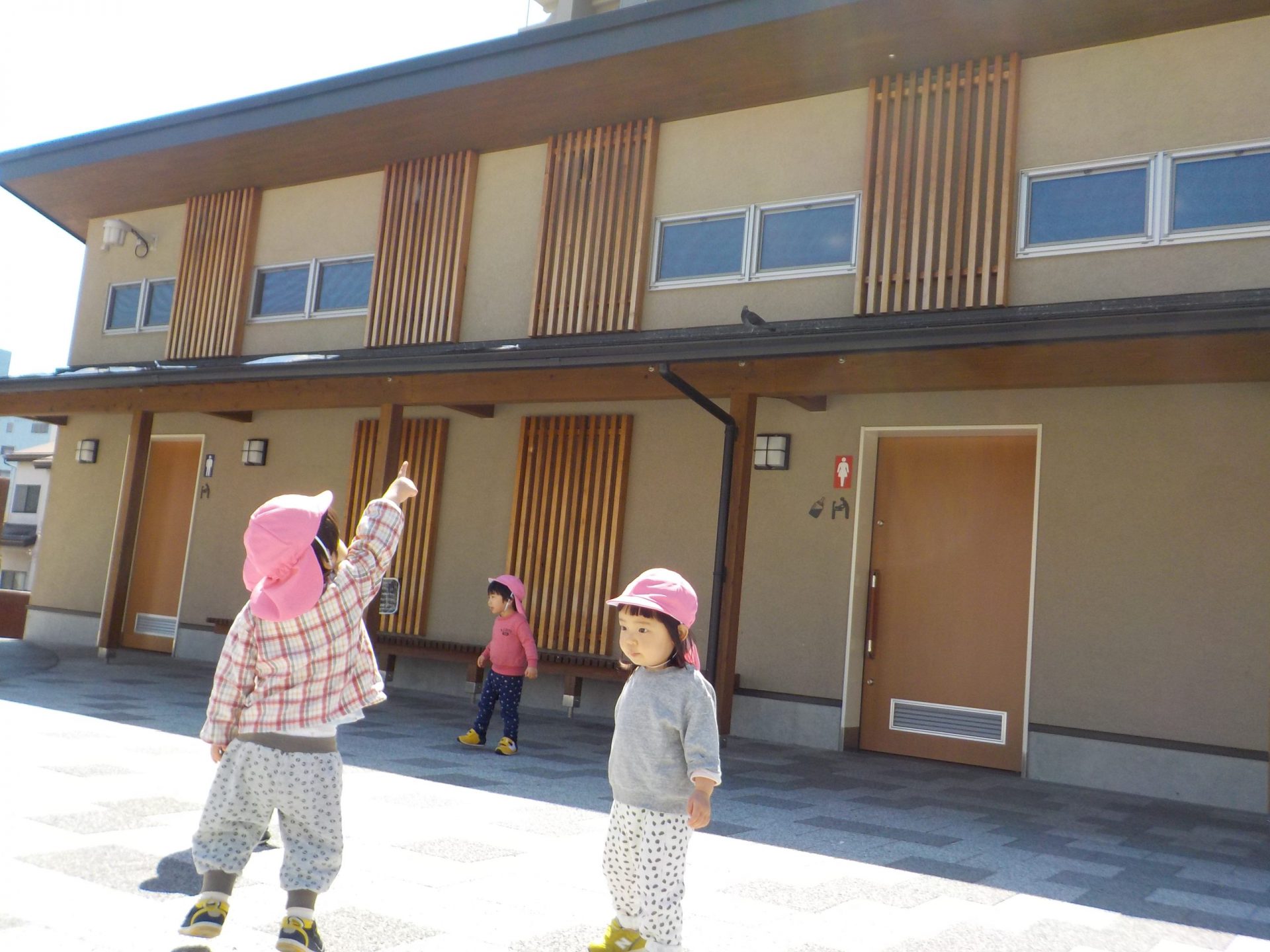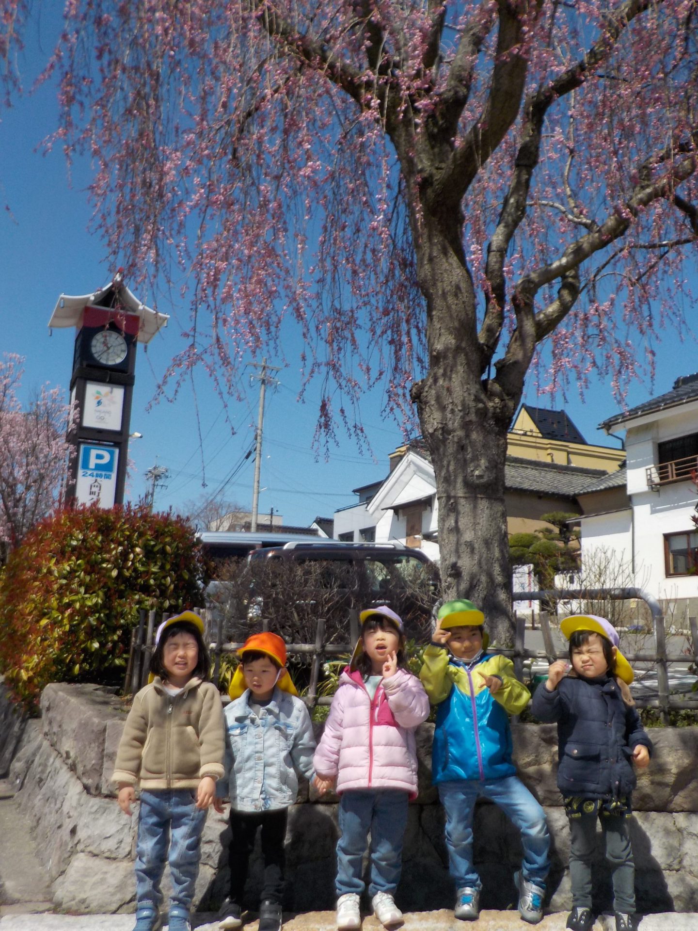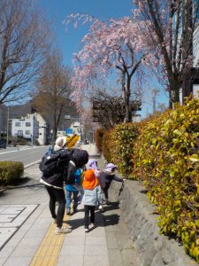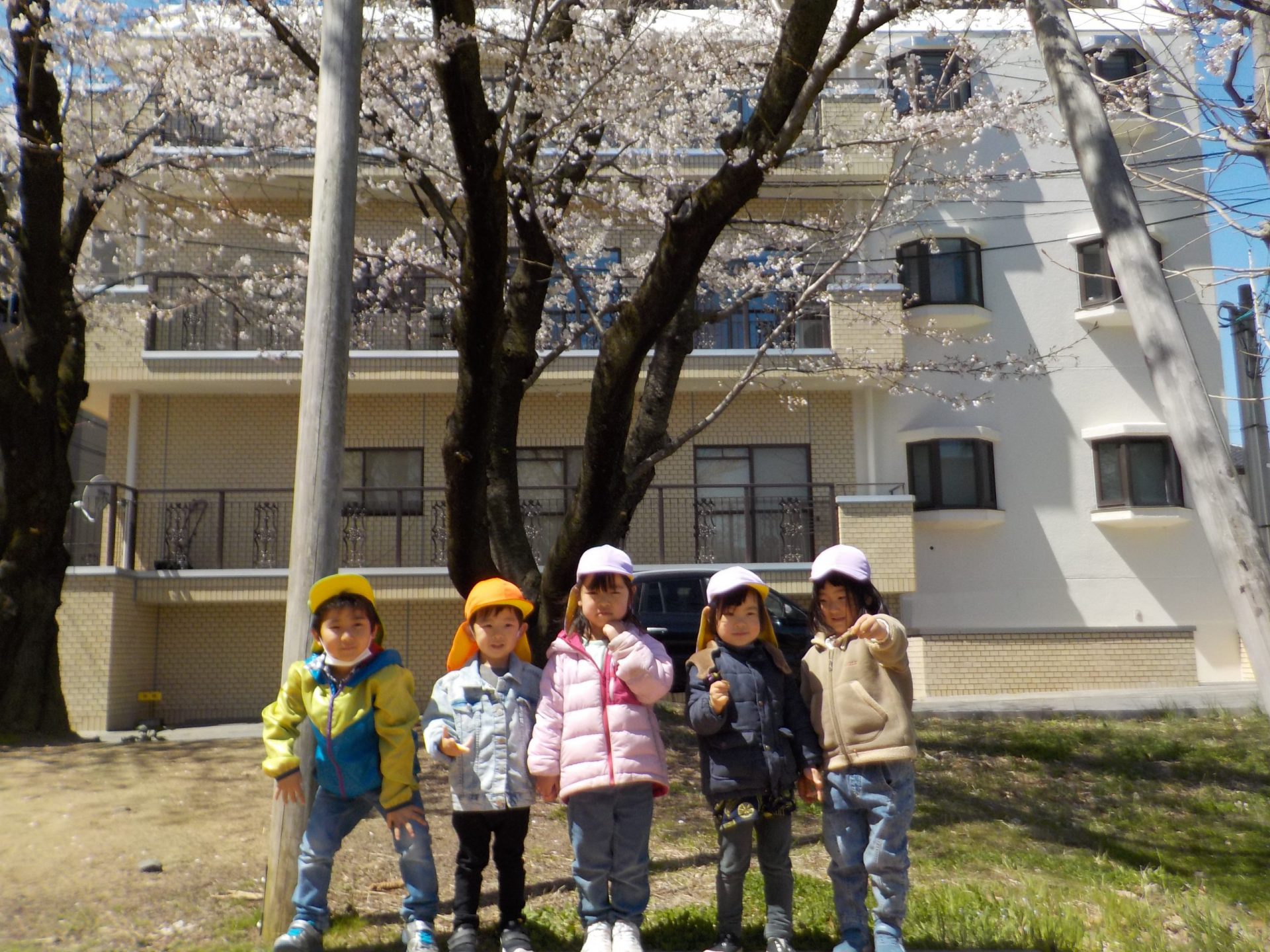 昨日の嵐が嘘のようないいお天気になりました。暖かな風に吹かれて、幼児さんは園周辺のお散歩に出かけました。まずは商業施設内に咲く、桜を発見しました。