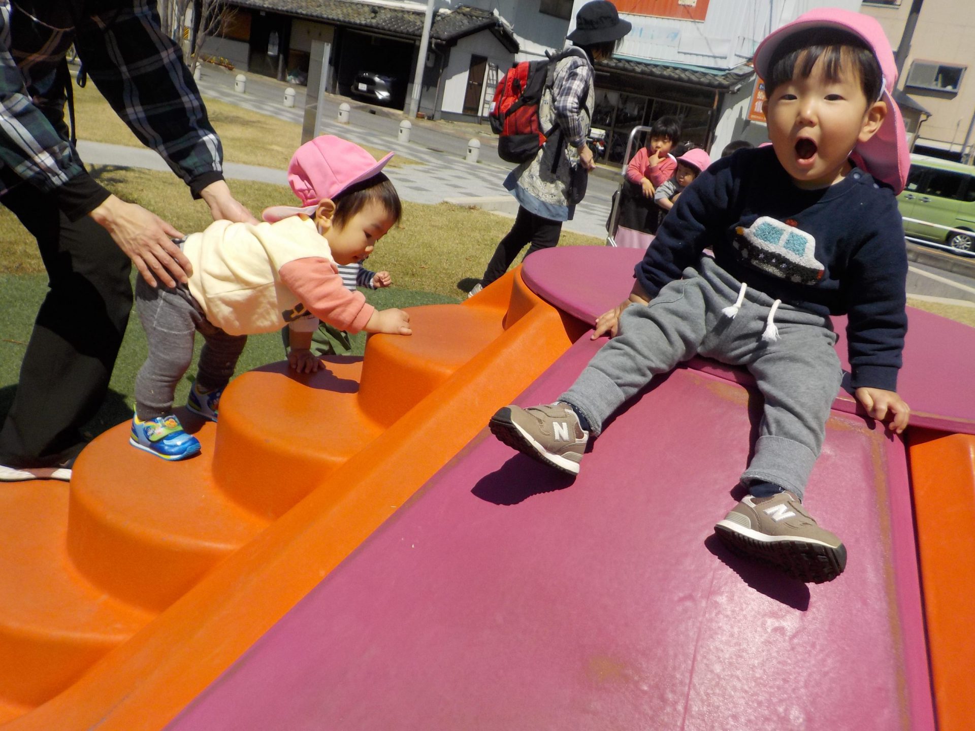 屋根の上に、ハトを発見!高いところにいるのを、よく見つけたね。滑り台も滑りました。