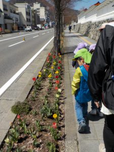 みんなでチューリップの歌を歌いながら歩いて行きました。最後は、園のお隣りの通称SL広場の桜を見ました。