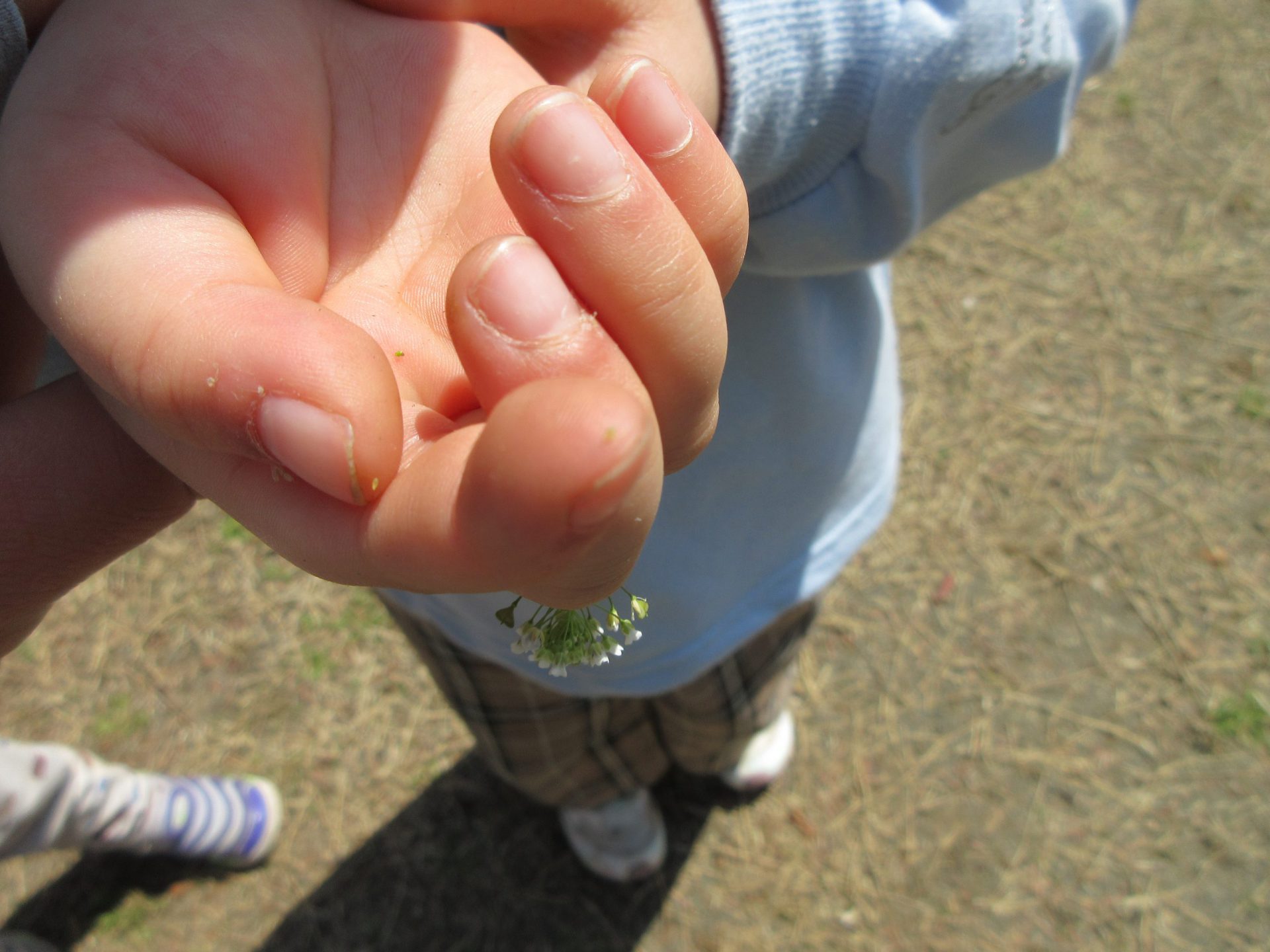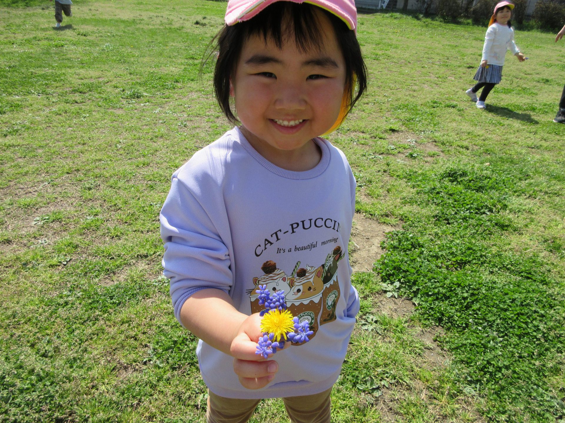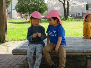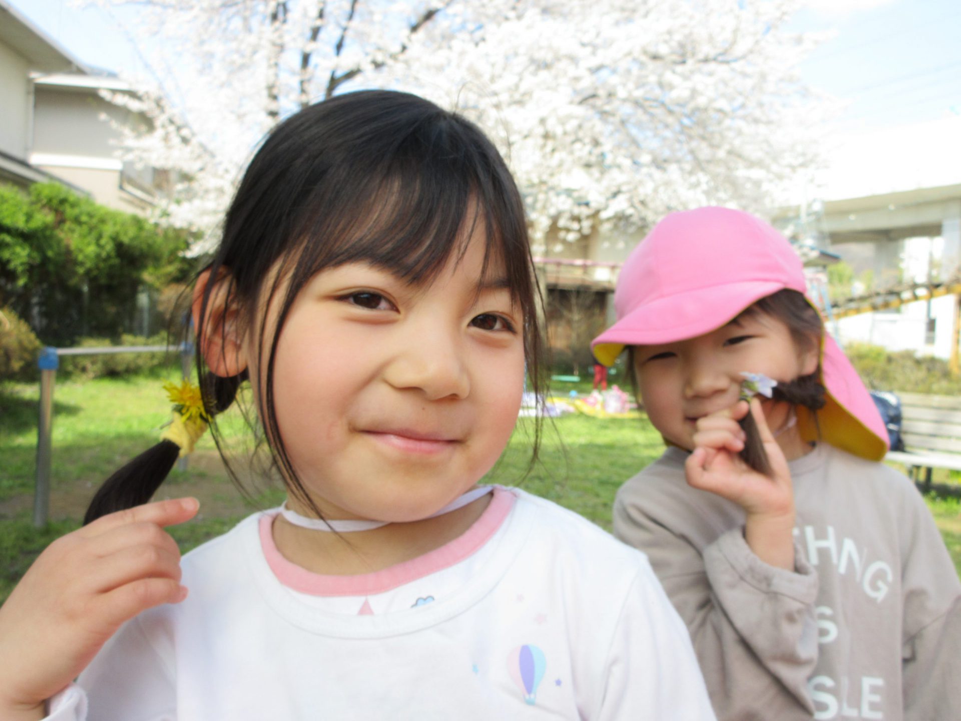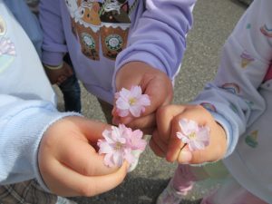 桜の花びらが落ちていて、「わぁ、かわいい~」と拾い集めたり、摘んだ草花を髪ゴムに差し入れて「みて、かわいいでしょ♡」とオシャレをしたりしていました。