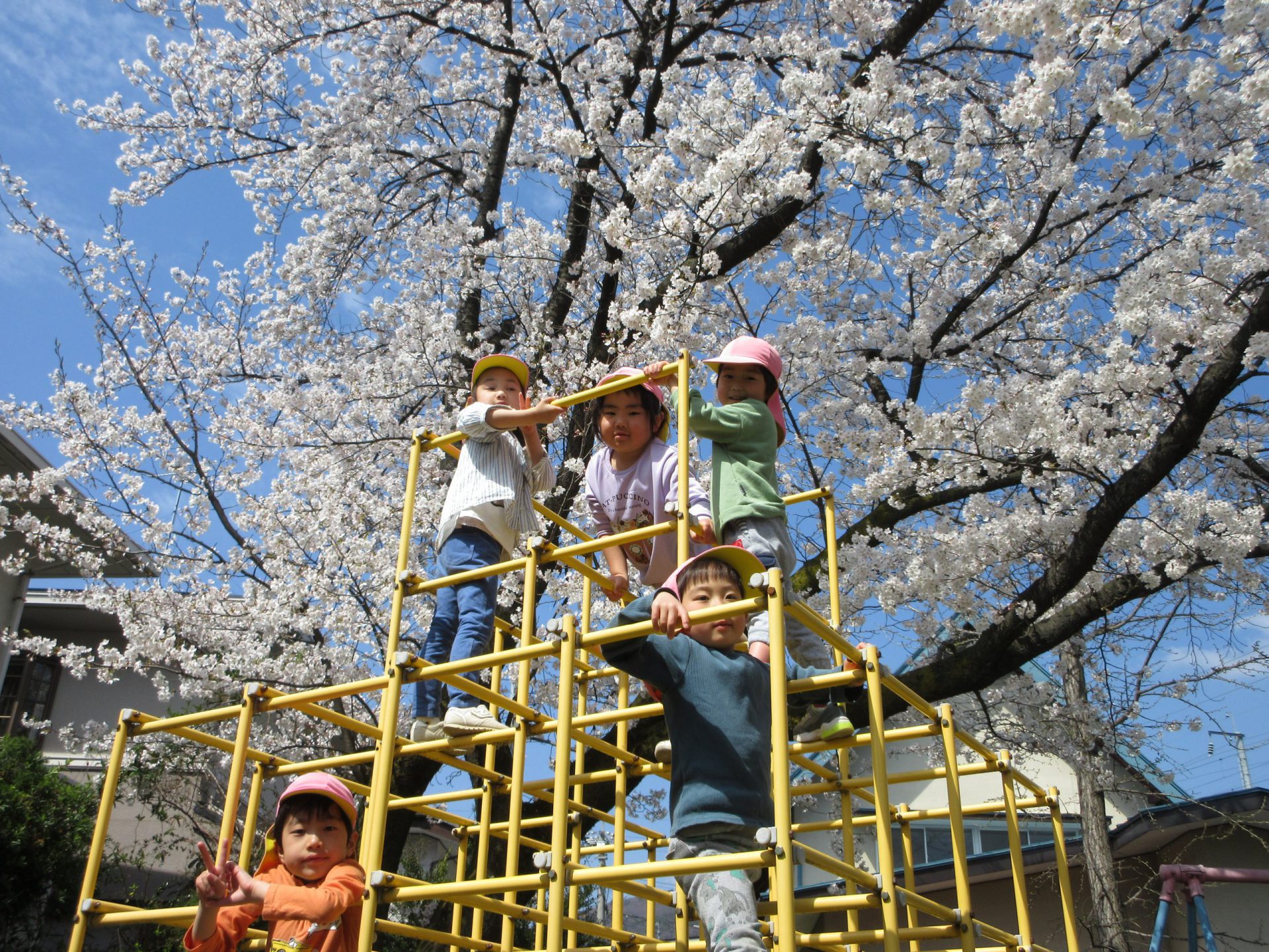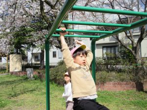 遊具のすぐそばにも桜の木があり、ジャングルジムに登ると「桜の木に届いたよ!」と嬉しそう♪