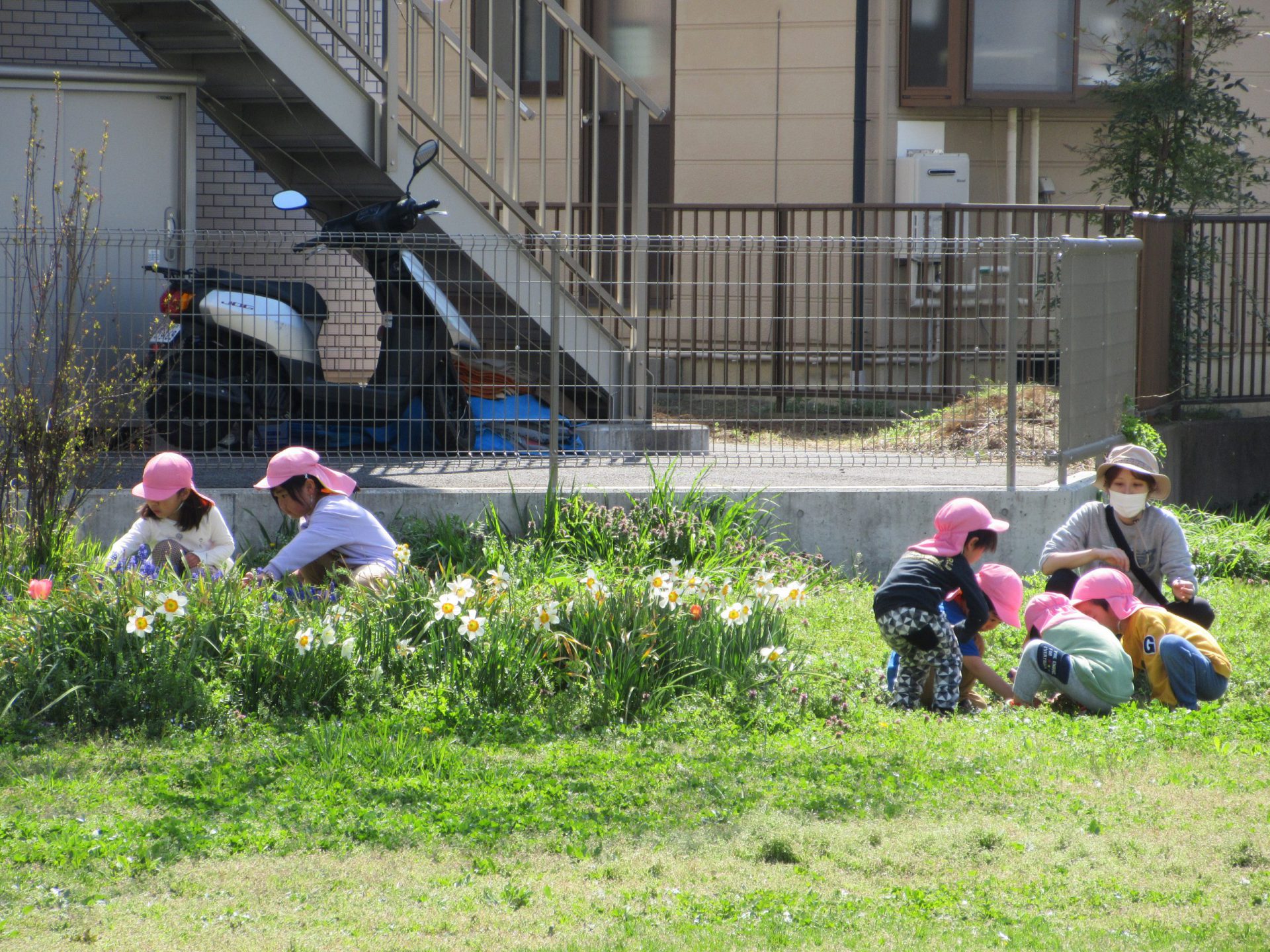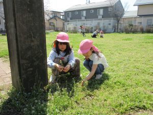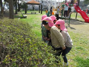 「とかちゃん(かなへび)いた!!」(※昨年飼っていたカナヘビの名前)と聞いてみんな集まってきます。「え、どこどこ?」「ホントだ~!」「今動いたね!」「小さくてかわいい~」「つれて帰りた~い」と子ども達。暖かくなり、冬眠から起きたカナヘビに昨日も今日もたくさん会うひまわり組さんでした。