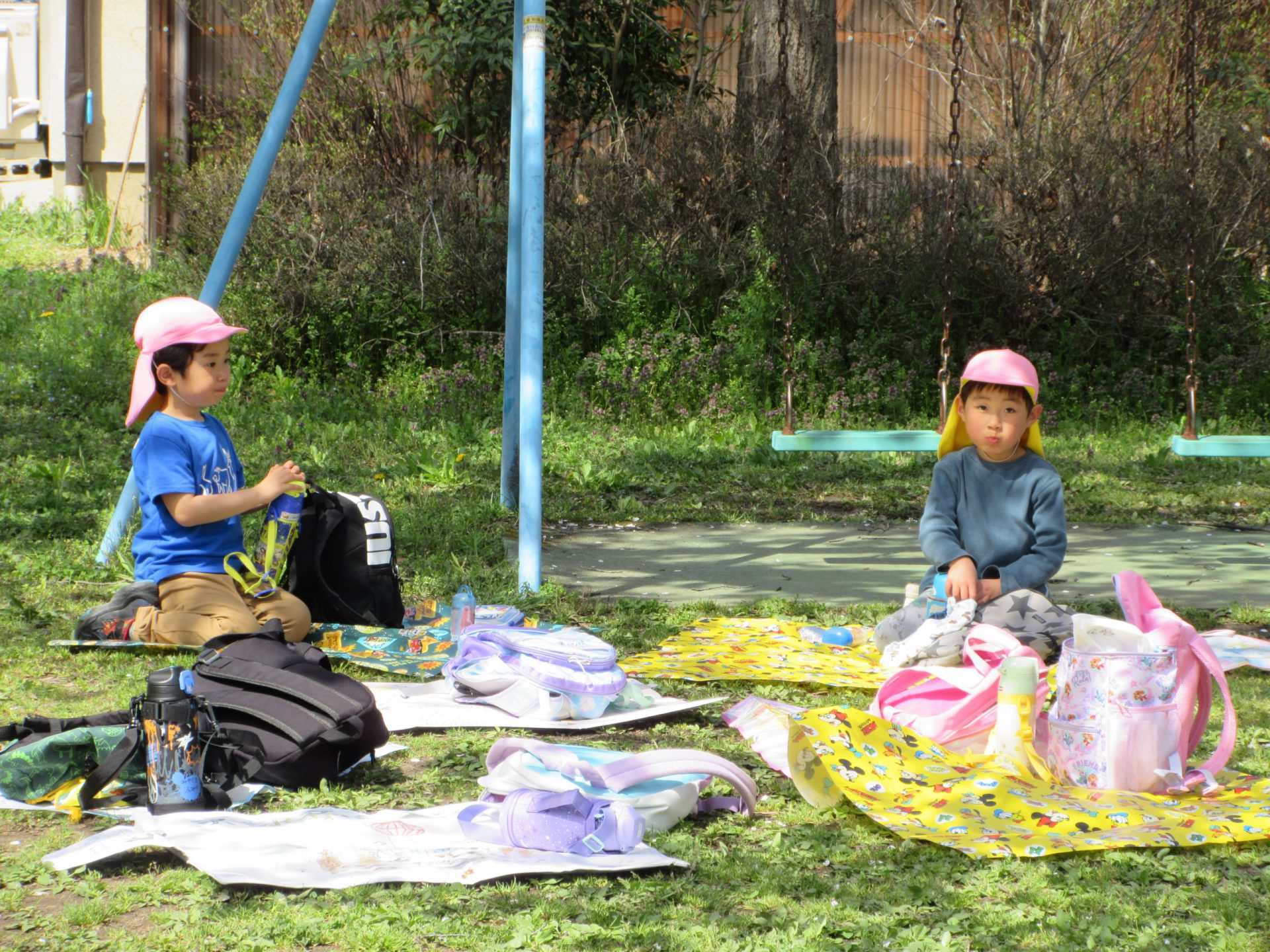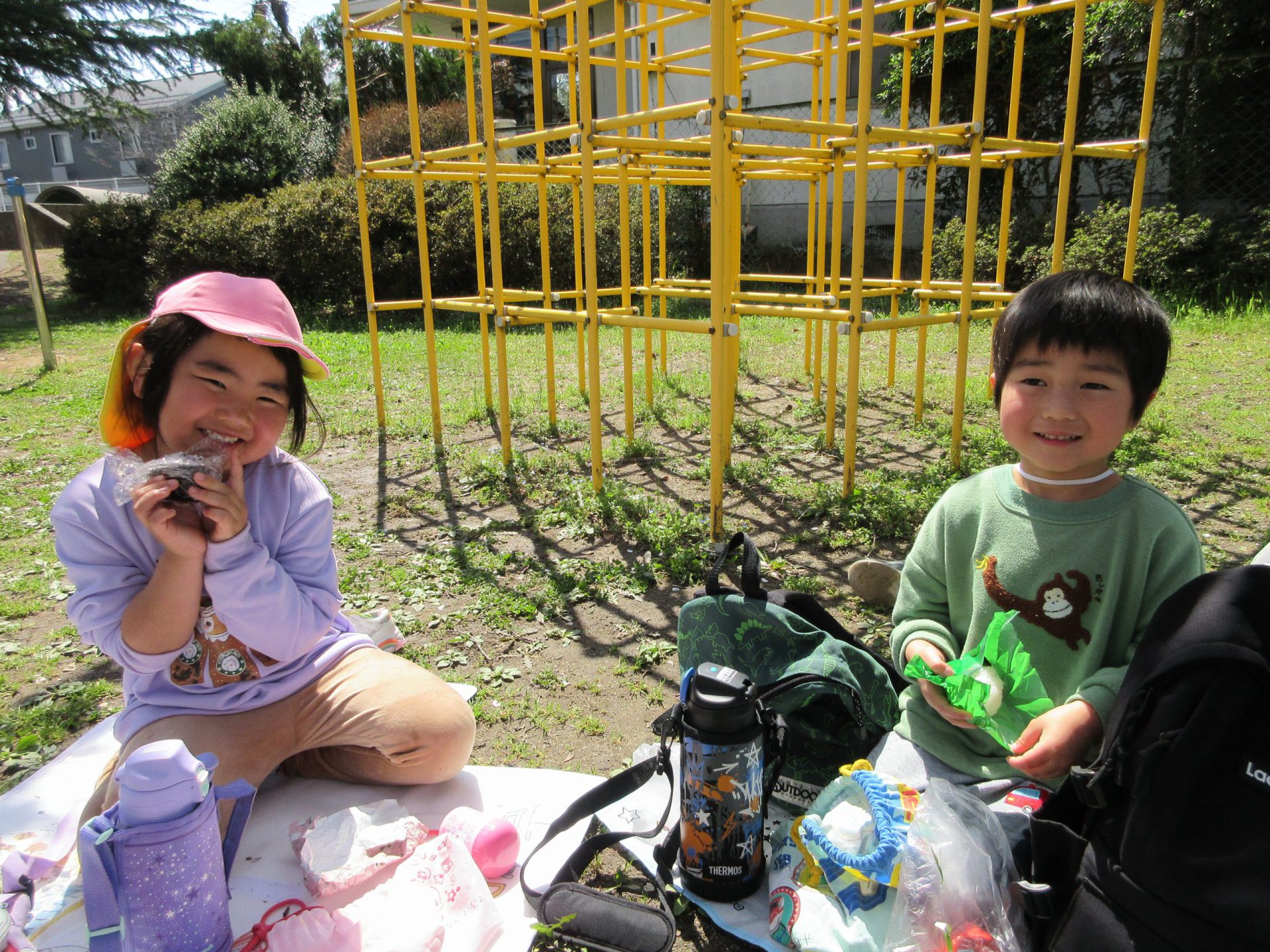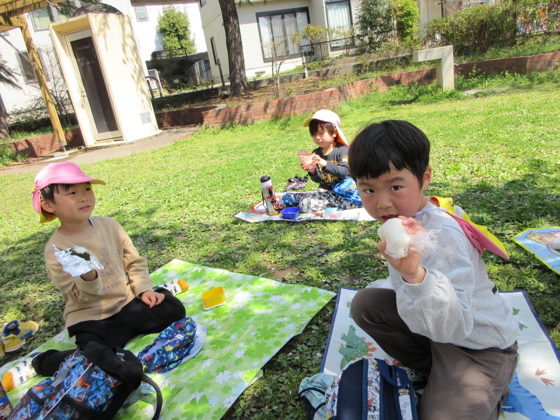 遊んでいる途中で、ひと休み・・・レジャーシートに座ってお花見をしながらの水分補給は格別!こまめに休憩をとりながら遊んでいました。