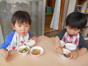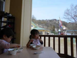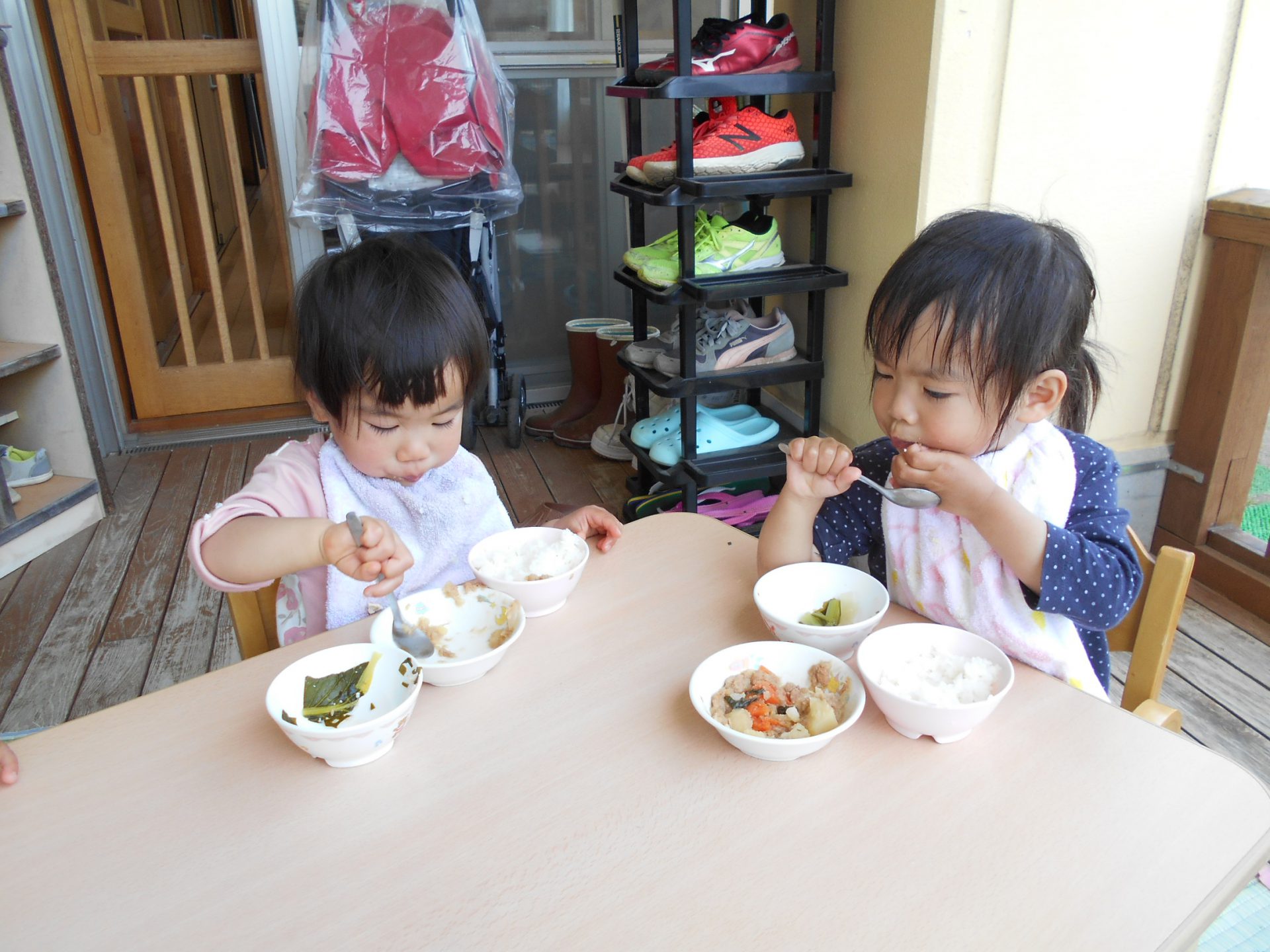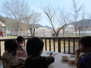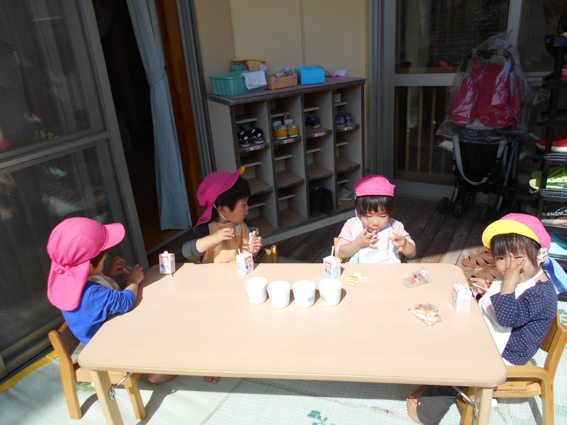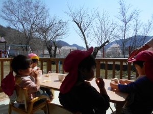 おやつと給食をテラスで食べ、春を満喫しました♪