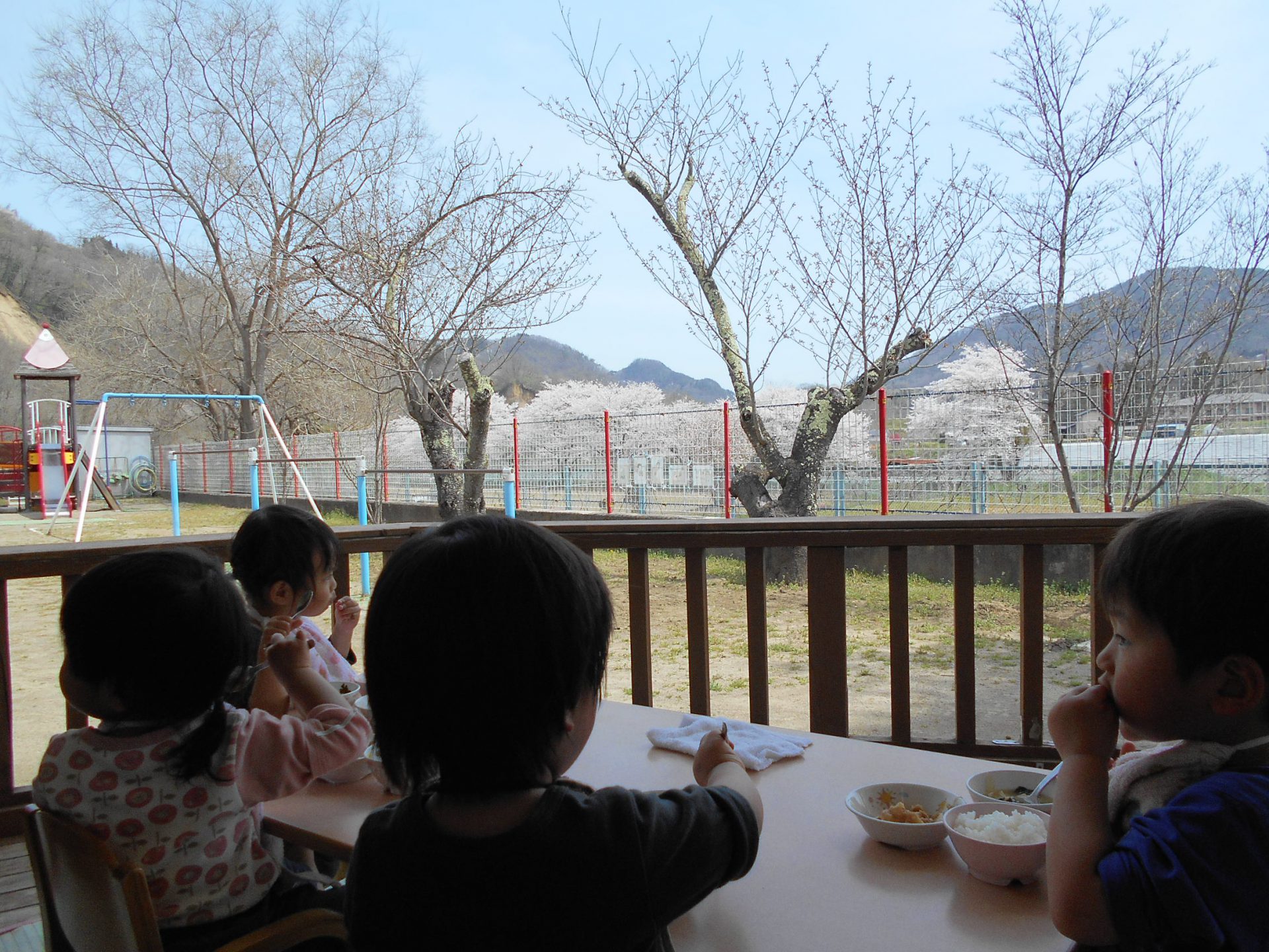 周辺に咲いている満開の桜を見たり、鳥の鳴く声を聞いたり、風の心地良さを感じたりしながら給食の時間を楽しみましたよ。