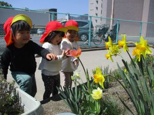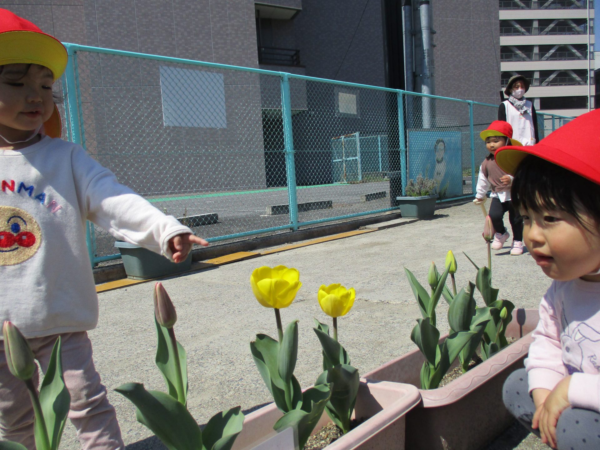 園庭で遊んでいると、チューリップの花を見つけた子ども達。