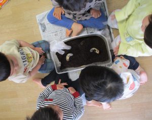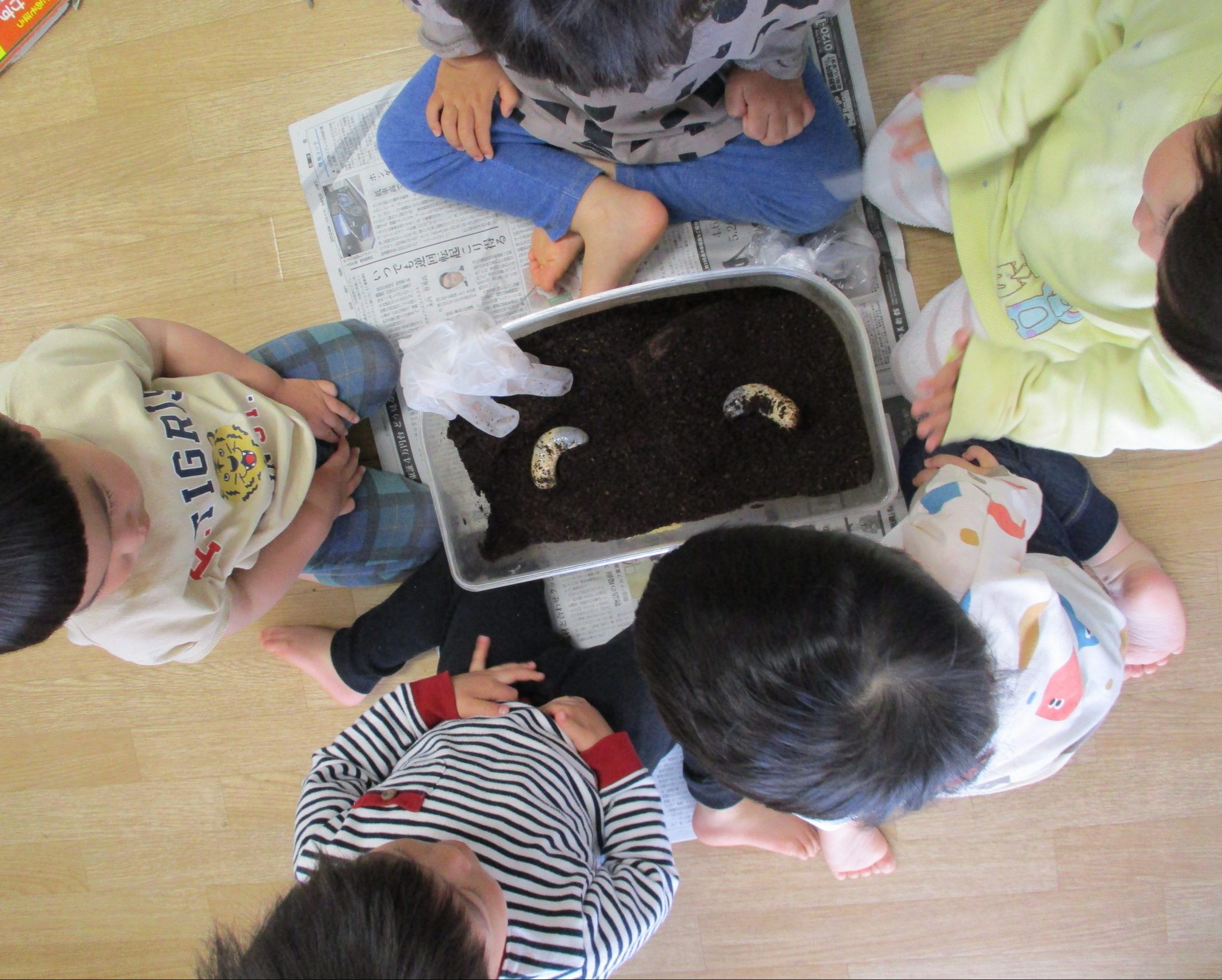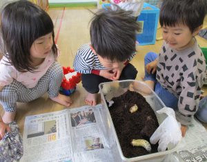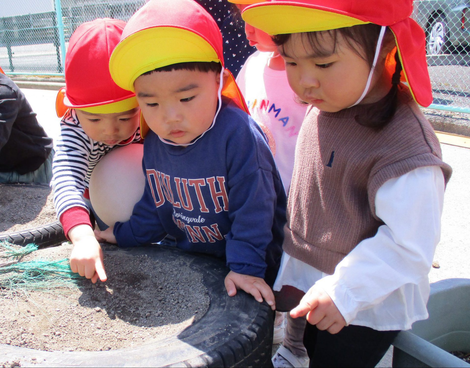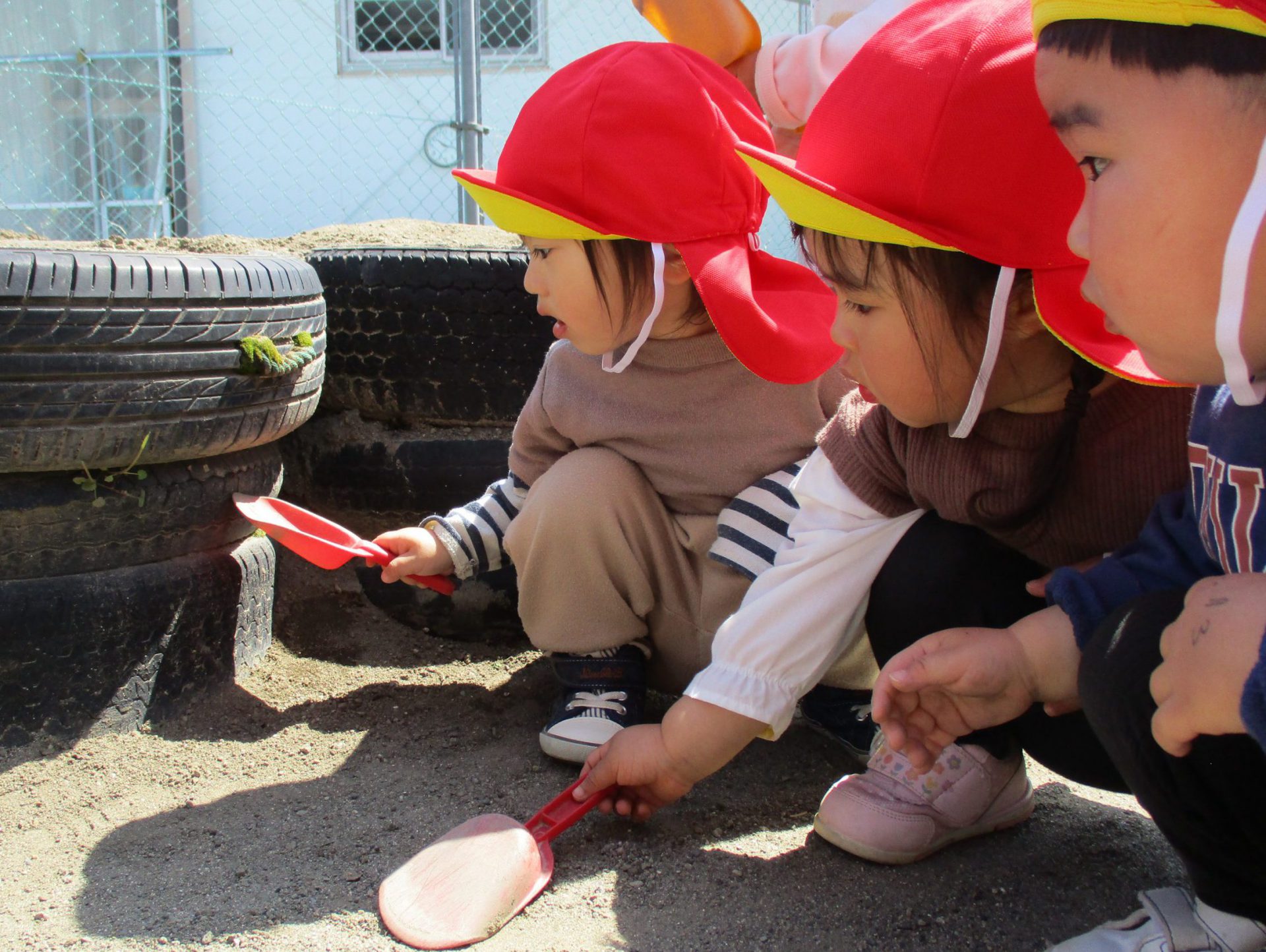 保育士が「砂を運んでおうちを大きくしているのかもね。」と言うと「アリさんすごい!」「工事?」と大興奮でした。