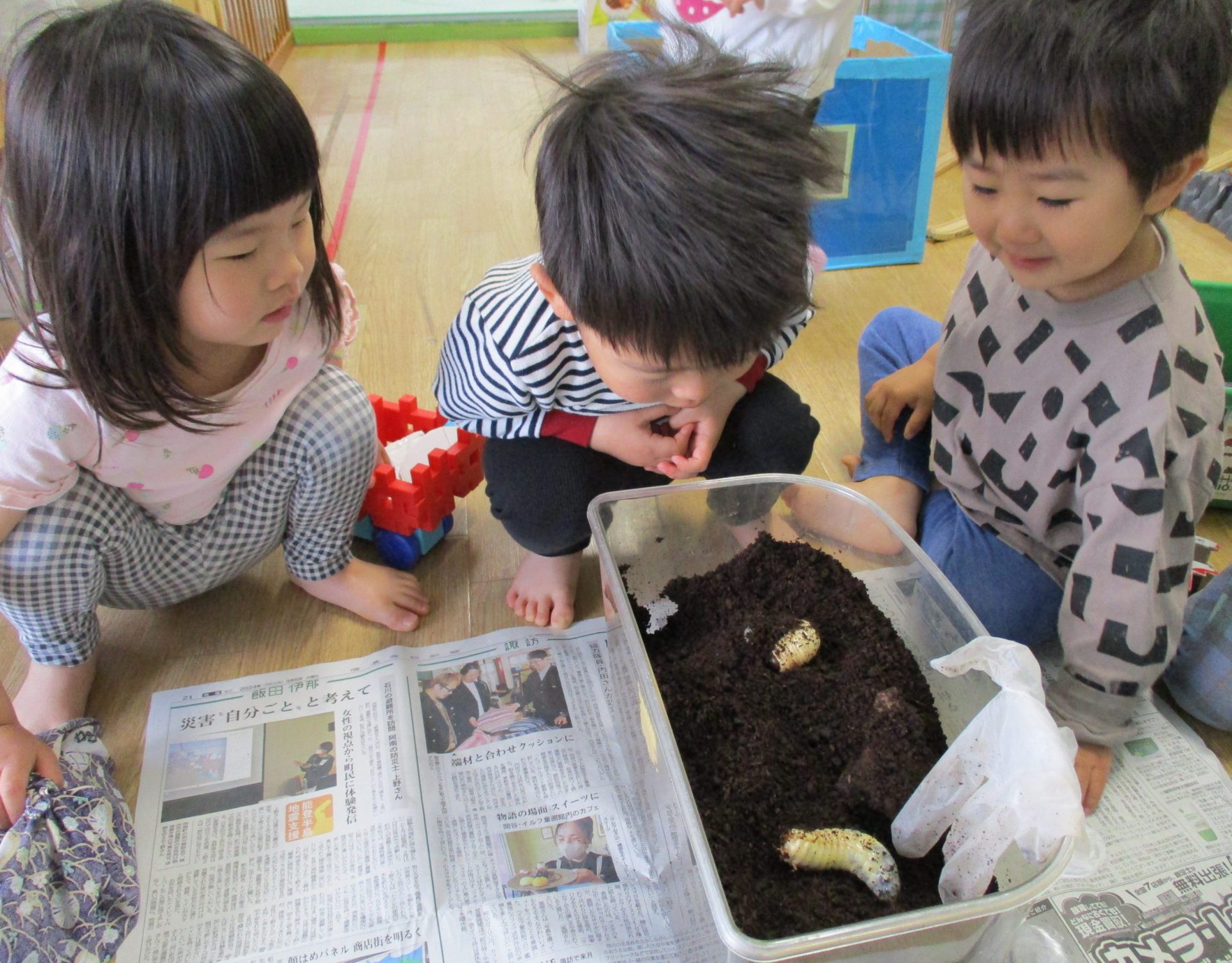 植物や虫に興味がいっぱいの子ども達。自然の不思議さに気付いたり、「なんで?」と疑問を持ったりする場面も見られます。