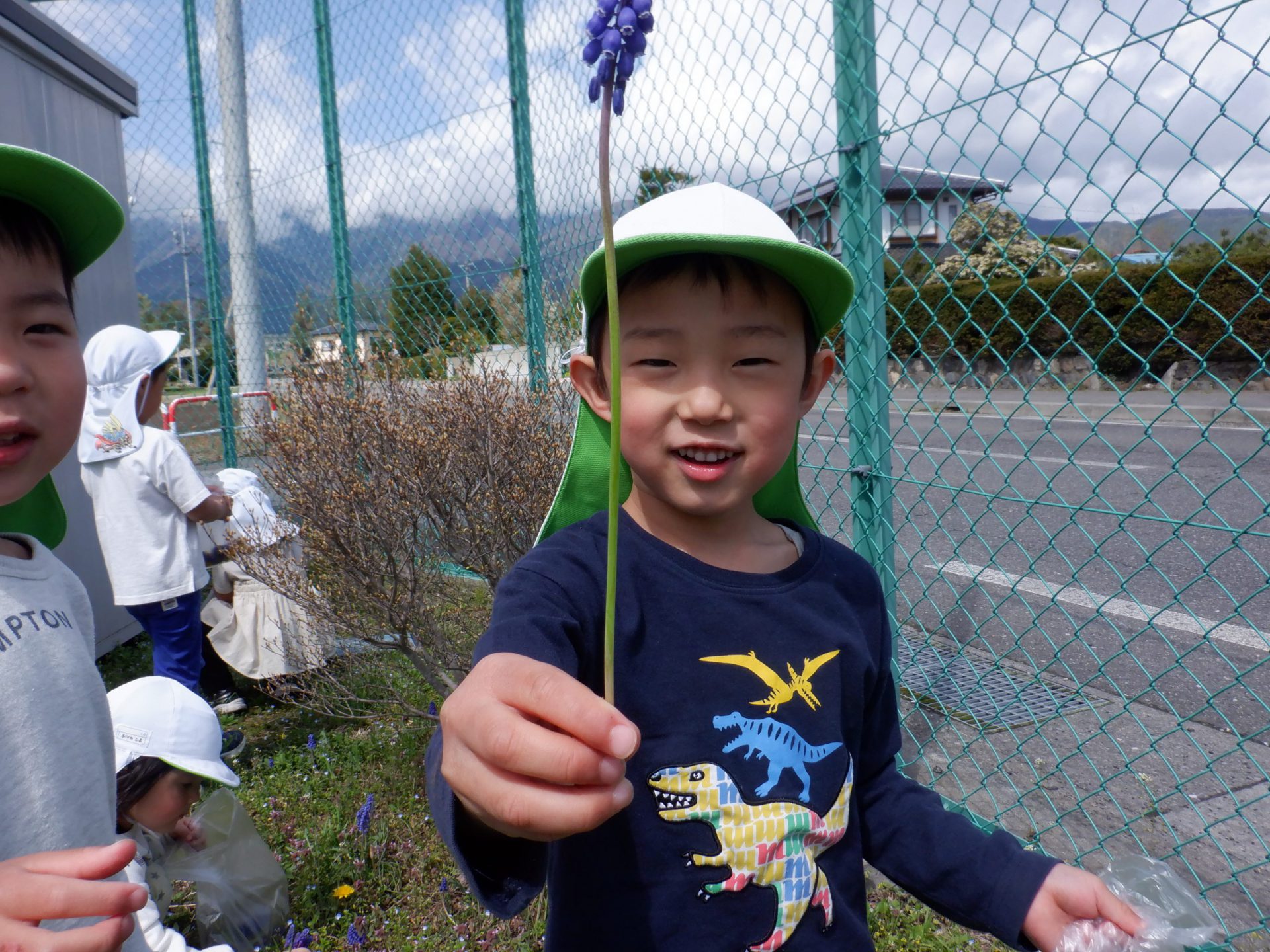 ムスカリの花を見つけ、「ぶどうみたいの見つけた」保育士に名前を教えてもらい「ムスカリだって!」と、たくさんの春を見つけていました。