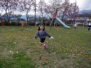 桜の花びらが散ってくると「ゆきみたい」と落ちてくる様子を楽しんでいました。
