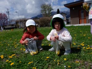 たんぽぽを摘んだ手を見て、「きいろになった」と友達と保育士に見せていました。