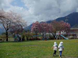 前の週に春探しの散歩に出かけ、桜を見つけ喜んでいた子どもたち。