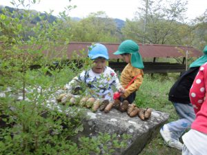 順番待ちに飽きた子が、長い松ぼっくりを集めてきて