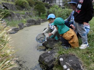 保育士が体を支えながらも身を乗り出し、水草をかき分けながら捕獲していました。採り終わったった後のどや顔↓