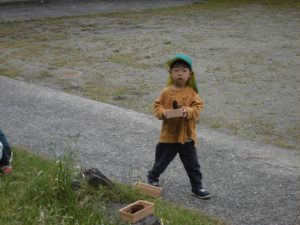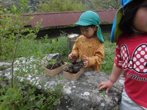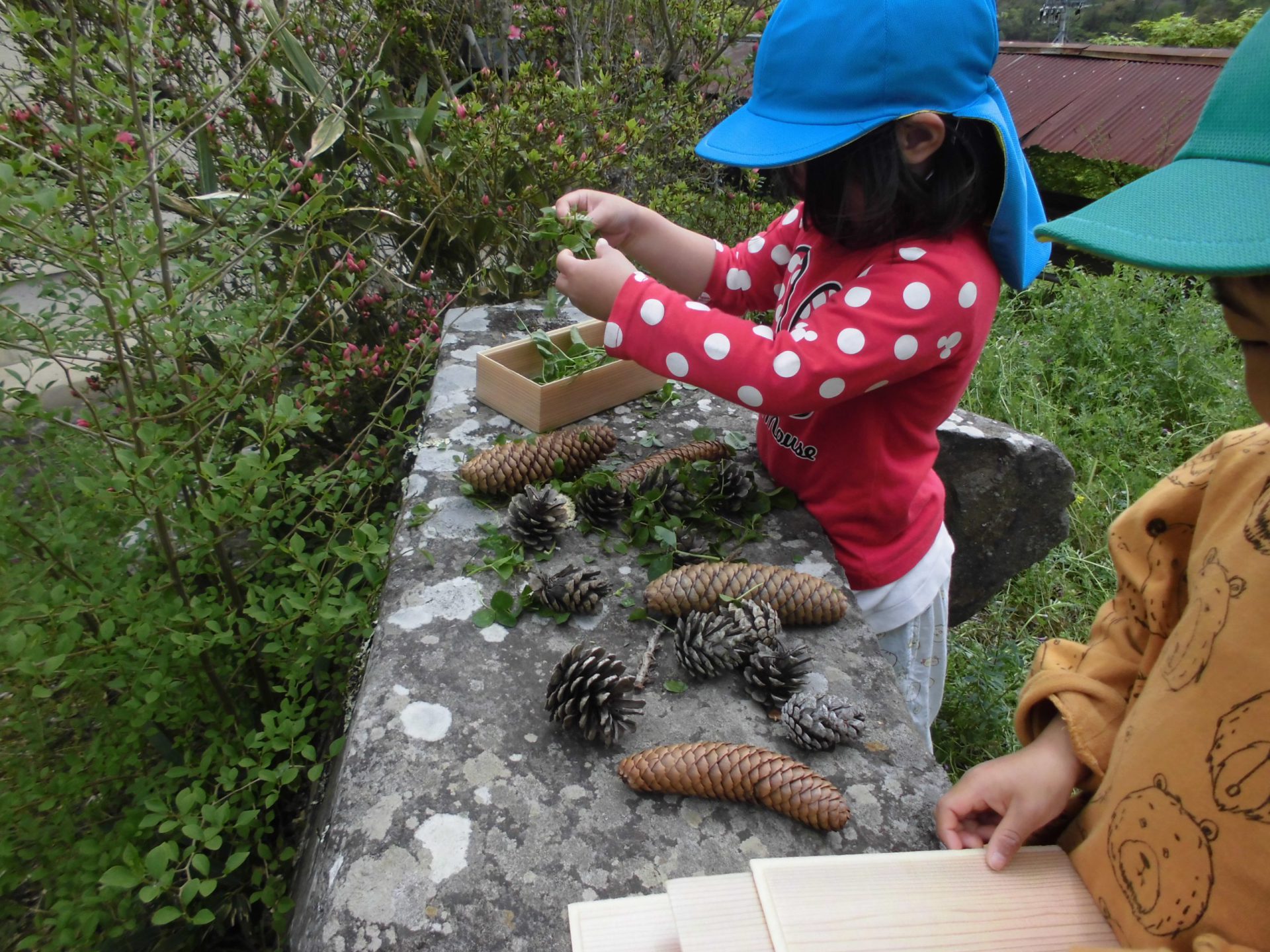 いろいろな自然物で、自分の楽しみを見つけてあっという間の1時間でした。遊具もたのしいけれど、友達の姿を見て自分の楽しみを見つけていました。
