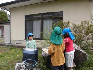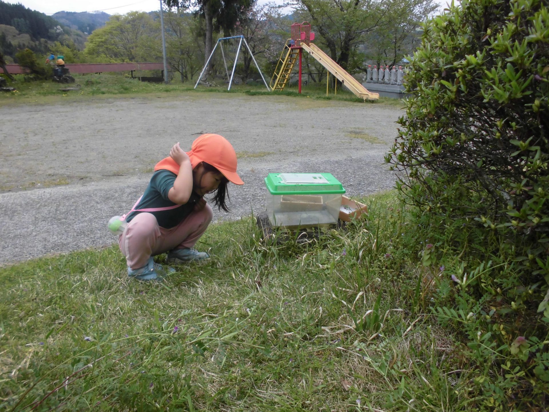 採っていたオタマジャクシは、全部もって帰ろうかどうしようか迷いましたが、子どもたちに聞きながら「4匹だけにする」と話し合って園に連れ帰りました。