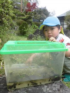 食事中、給食の先生から「これ、何のあかちゃんか知ってる?」と聞かれたときに答えられない子もいたので、このオタマジャクシがどうなって行くのか一緒に観察していきたいと思いました。